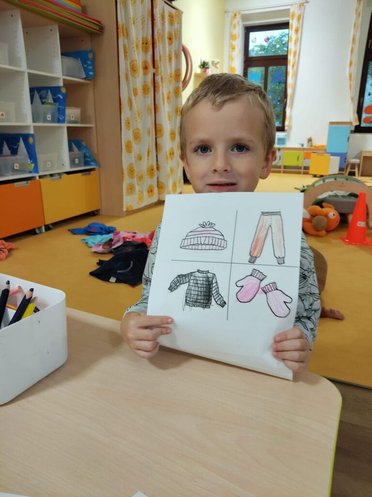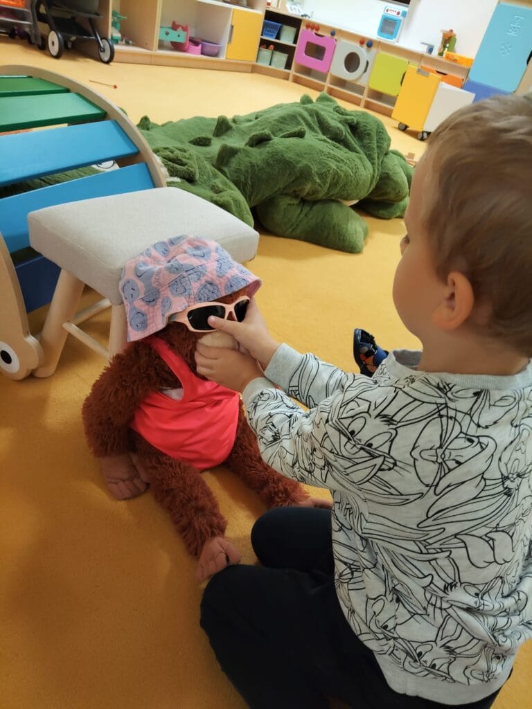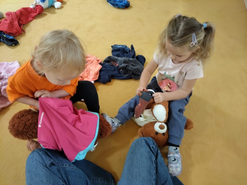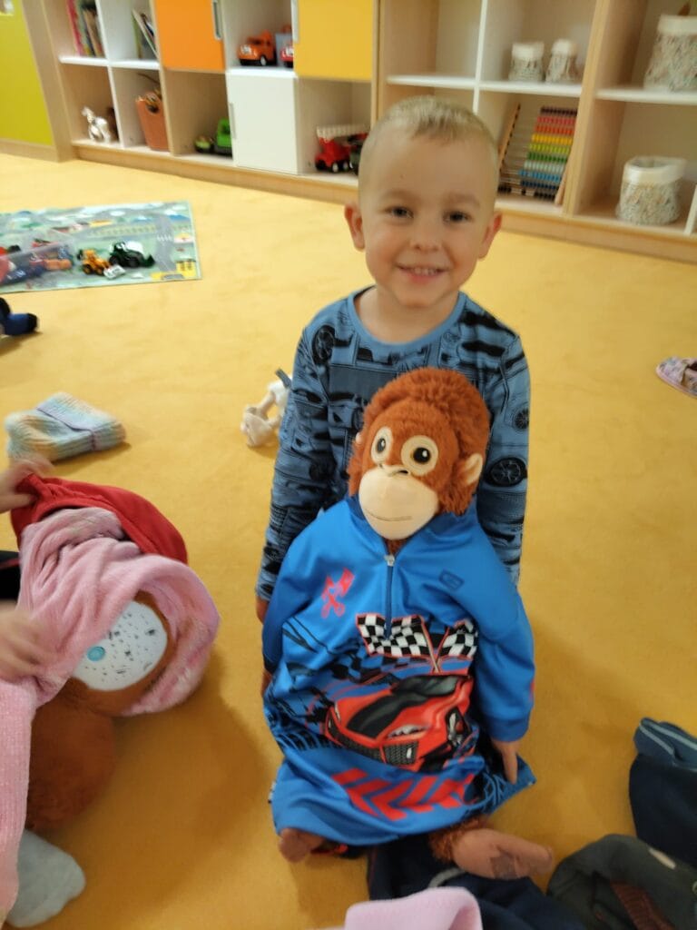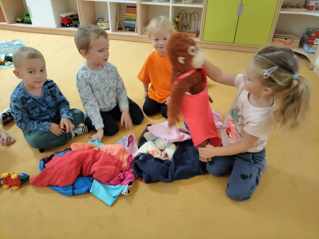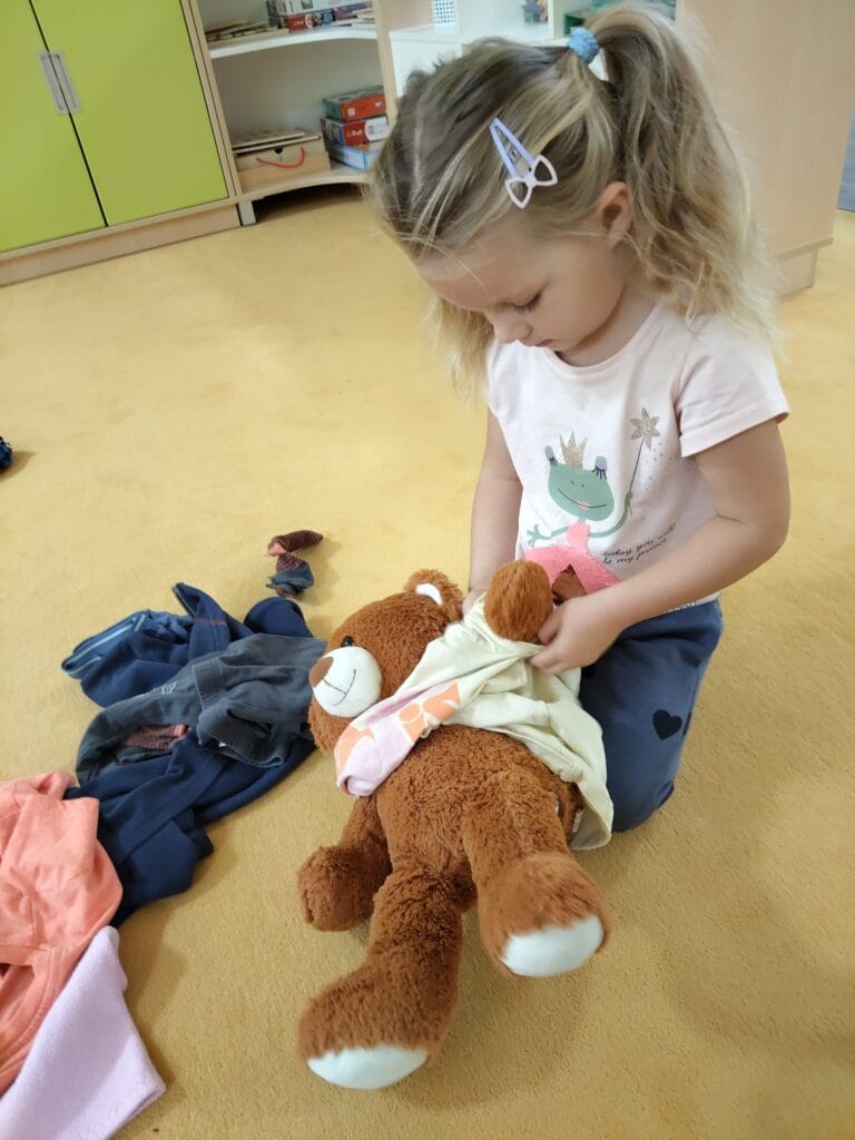 Téma oblečení jsme si zpestřili oblékáním plyšových kamarádů, což děti nejen velmi bavilo, ale také výborně namotivovalo k větší snaze o samostatnost.