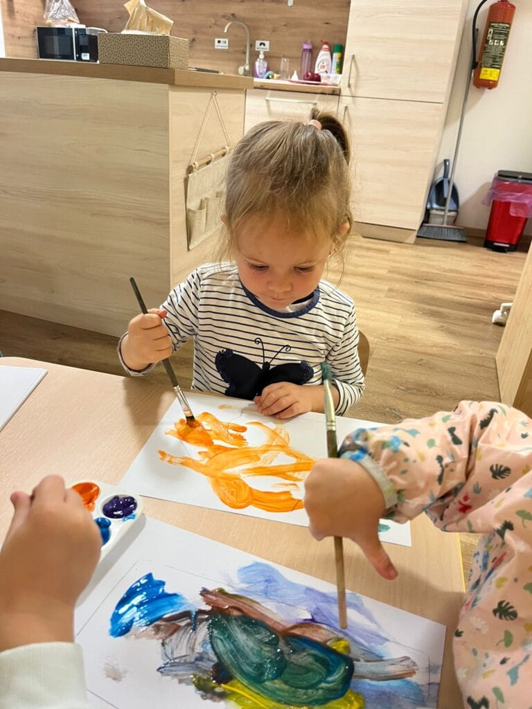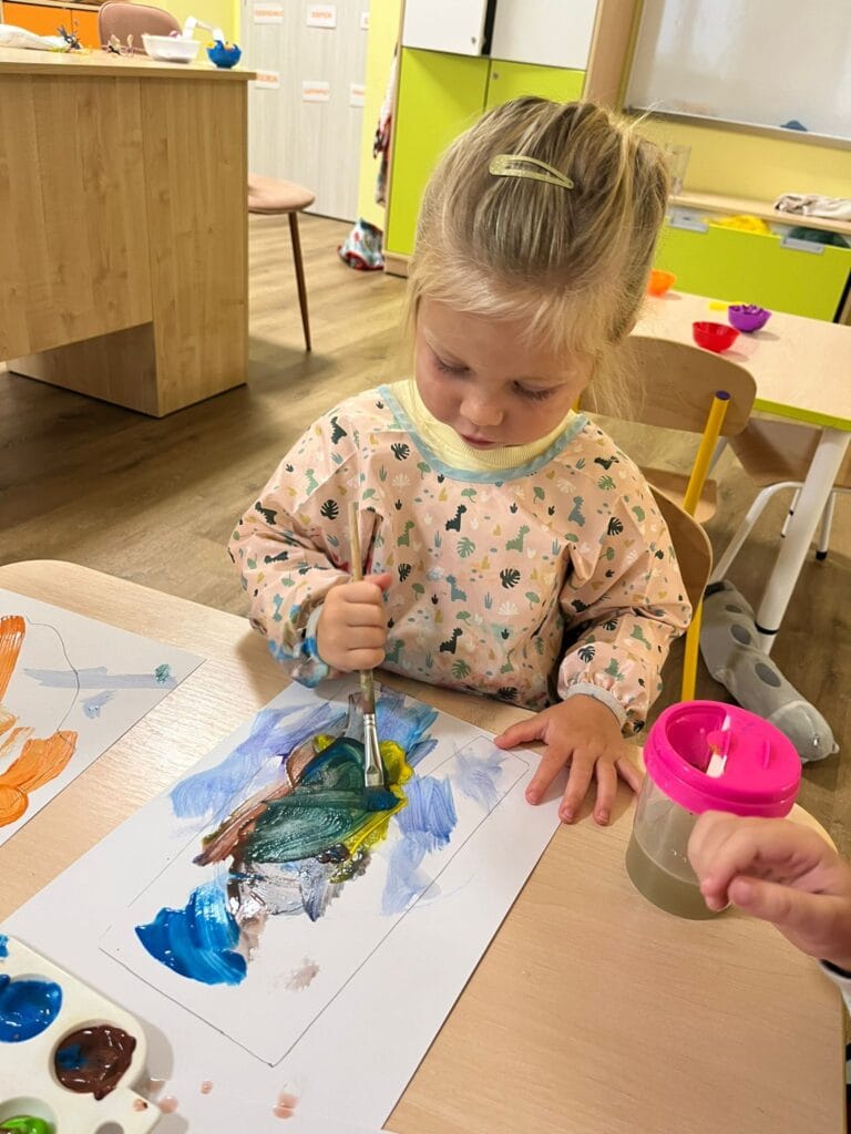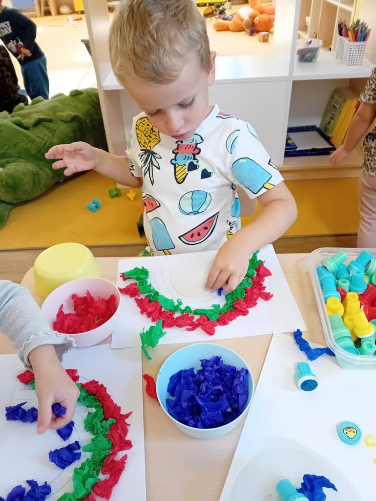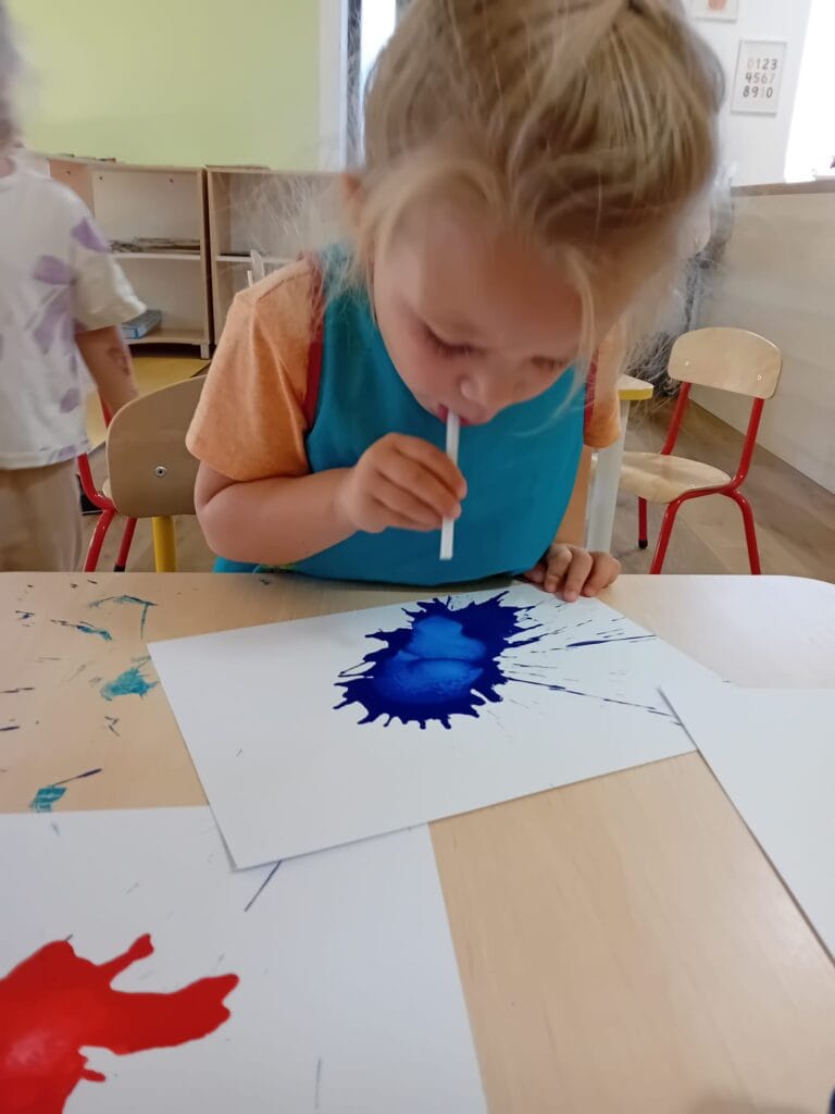 Z výtvarných technik si děti vyzkoušely například rozfoukání barvy pomocí brčkem. Jde o výborné dechové cvičení, které není vůbec snadné.