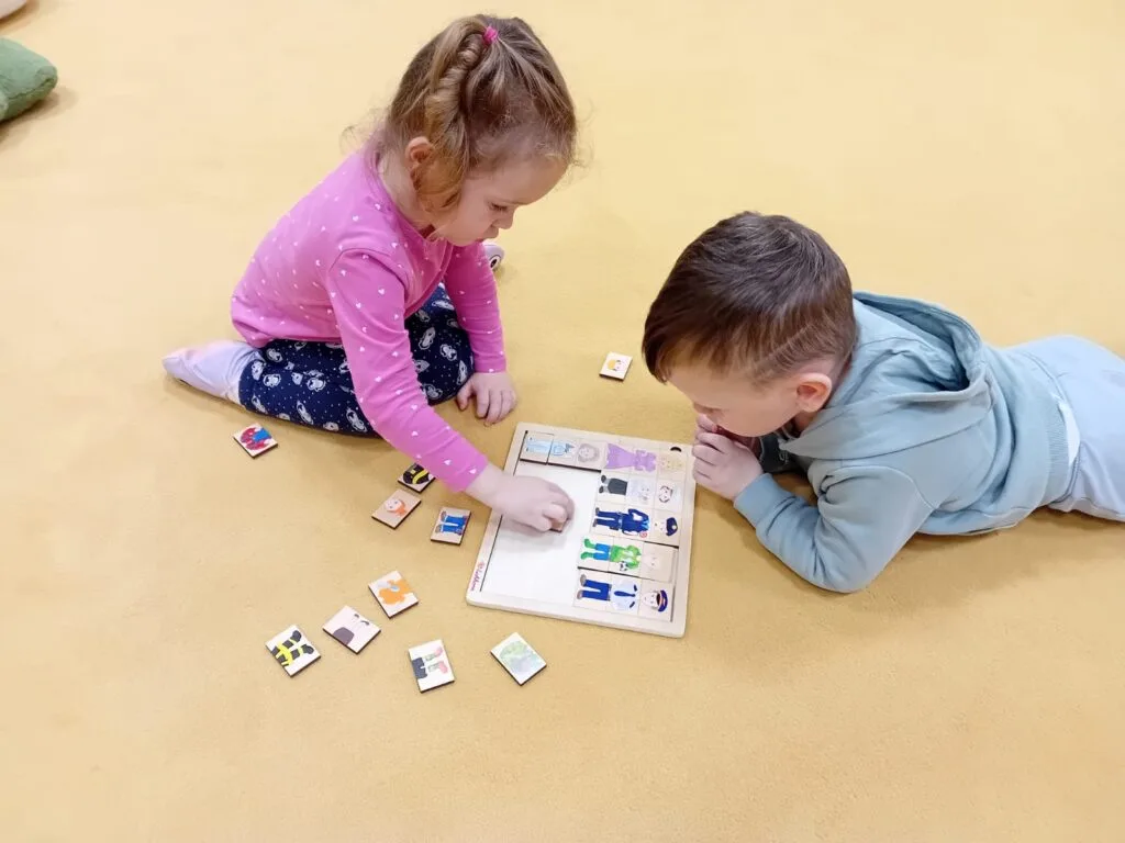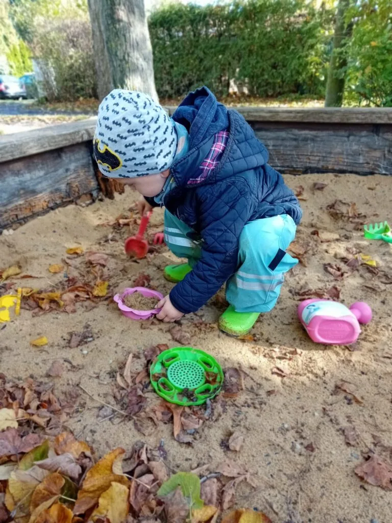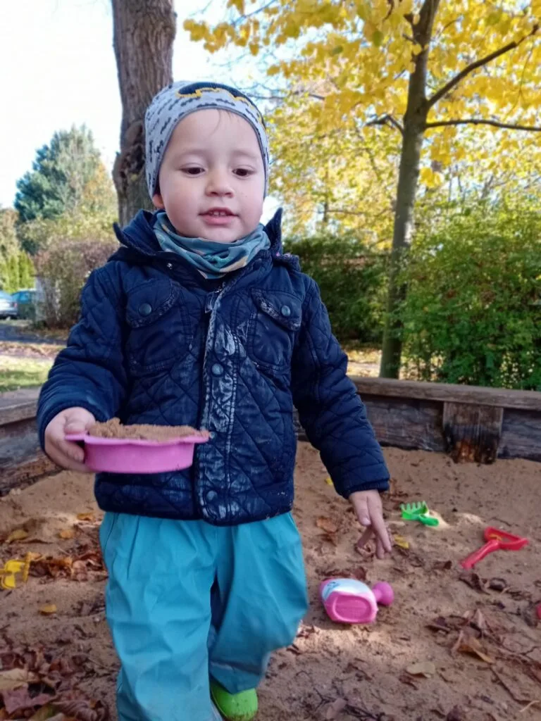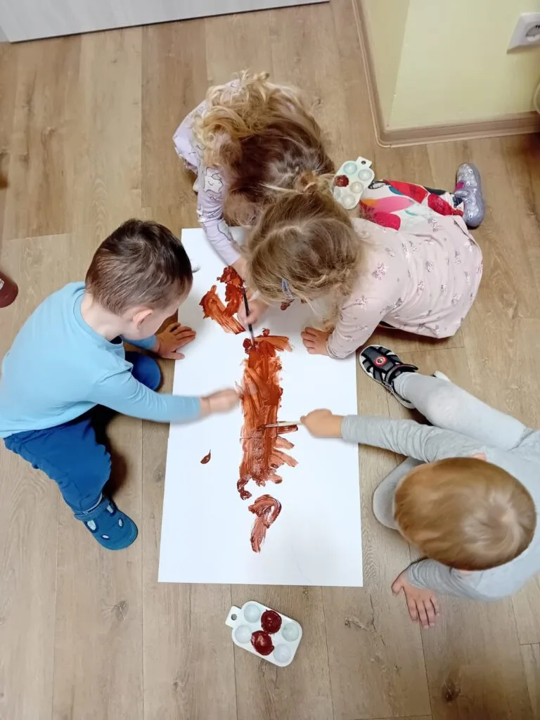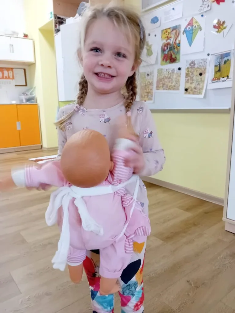 Kromě tématicky připravených činností jsme opět reagovali na podněty dětí. Pokračujeme ve stavbách přístřešků a bunkrů, kde si děti hrají na rodinu. Táta Tonda, máma Olí, jejich dítě Anthony, to už je zavedená trojice, tentokrát se k nim připojila Zarinka a Zojinka, takže měla máma Olí co dělat, aby všechny obstarala 🙂