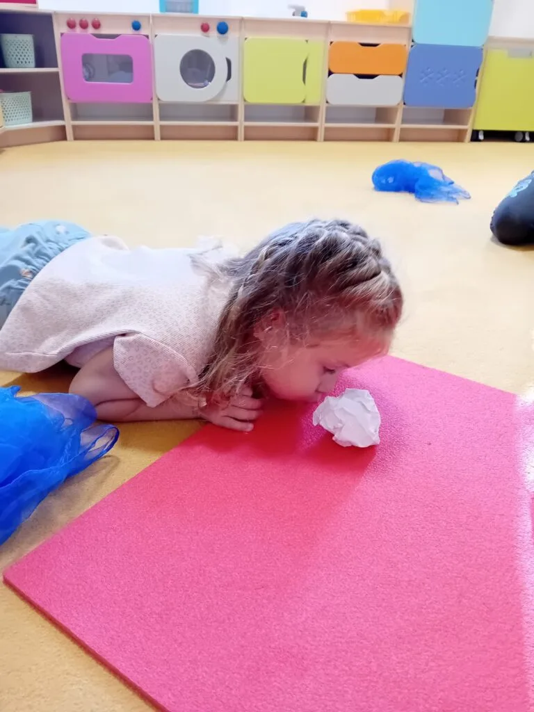 Při rozcvičce jsme si zahráli pohybovku na dračí ocásky, nebo hru “letí, neletí.” Výborné a náročné dechové cvičení jsme zapojili při hře na vítr, kdy si děti udělaly papírovou kouli a následně se ji vlastním dechem snažily přenést do cíle. Ač se to nezdá, je to opravdu fuška, při které děti parádně “protáhnou” bránici 🙂