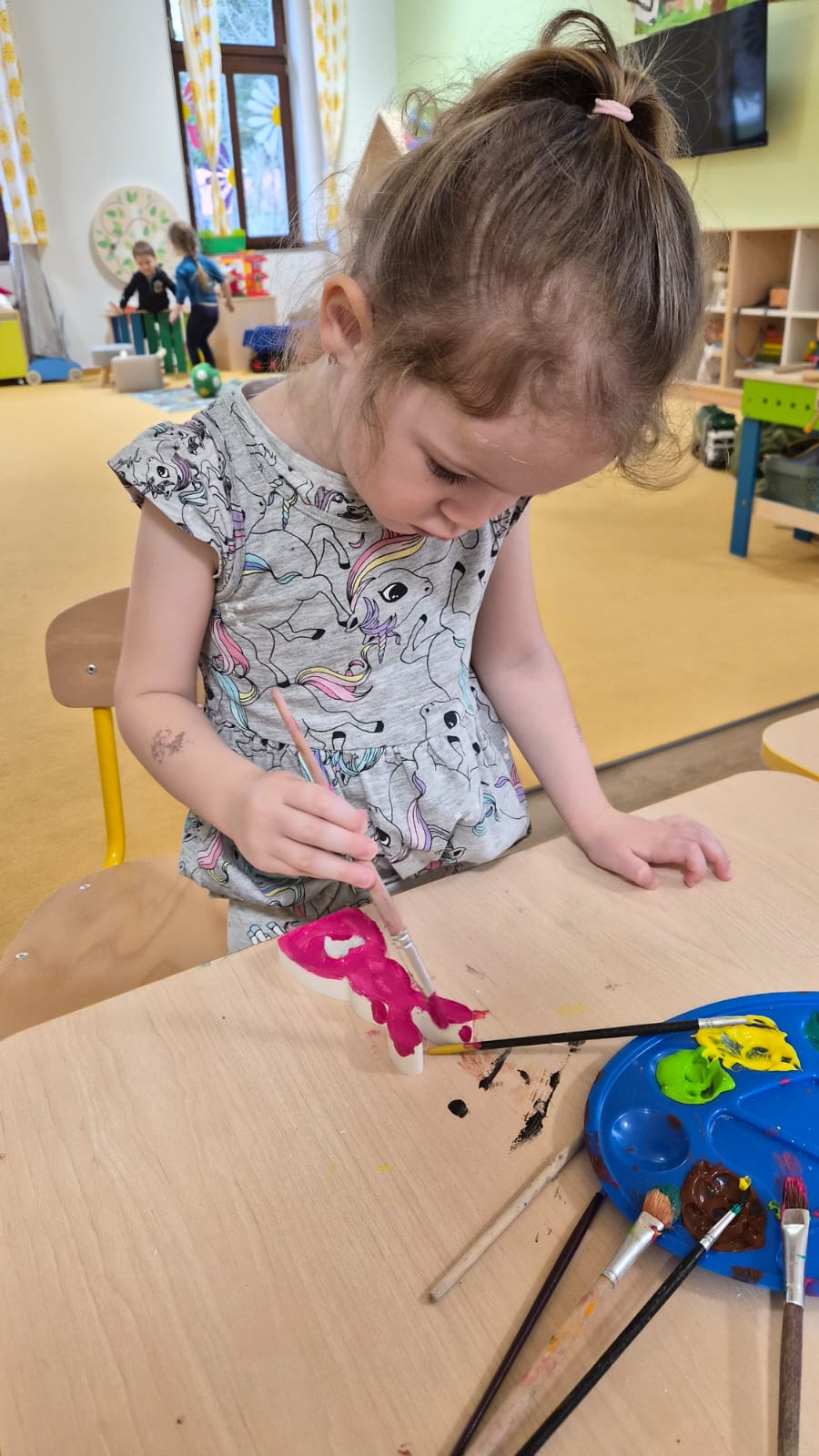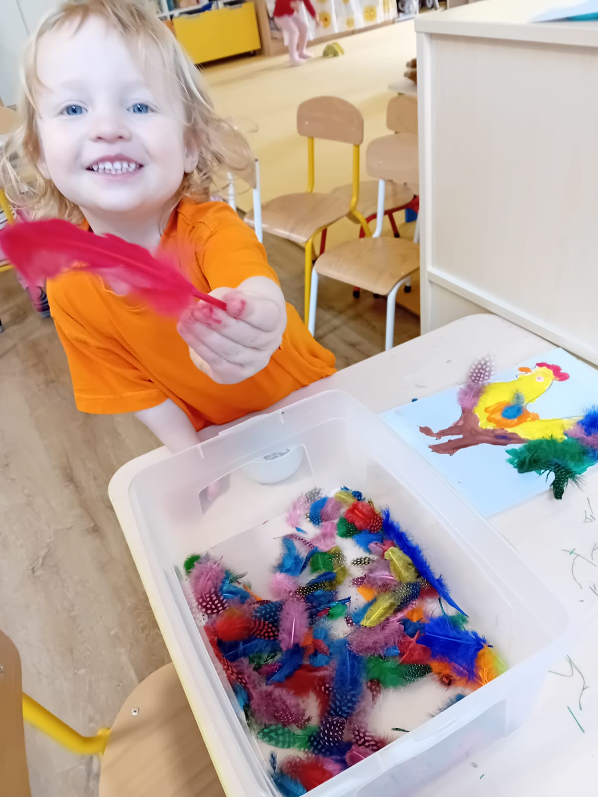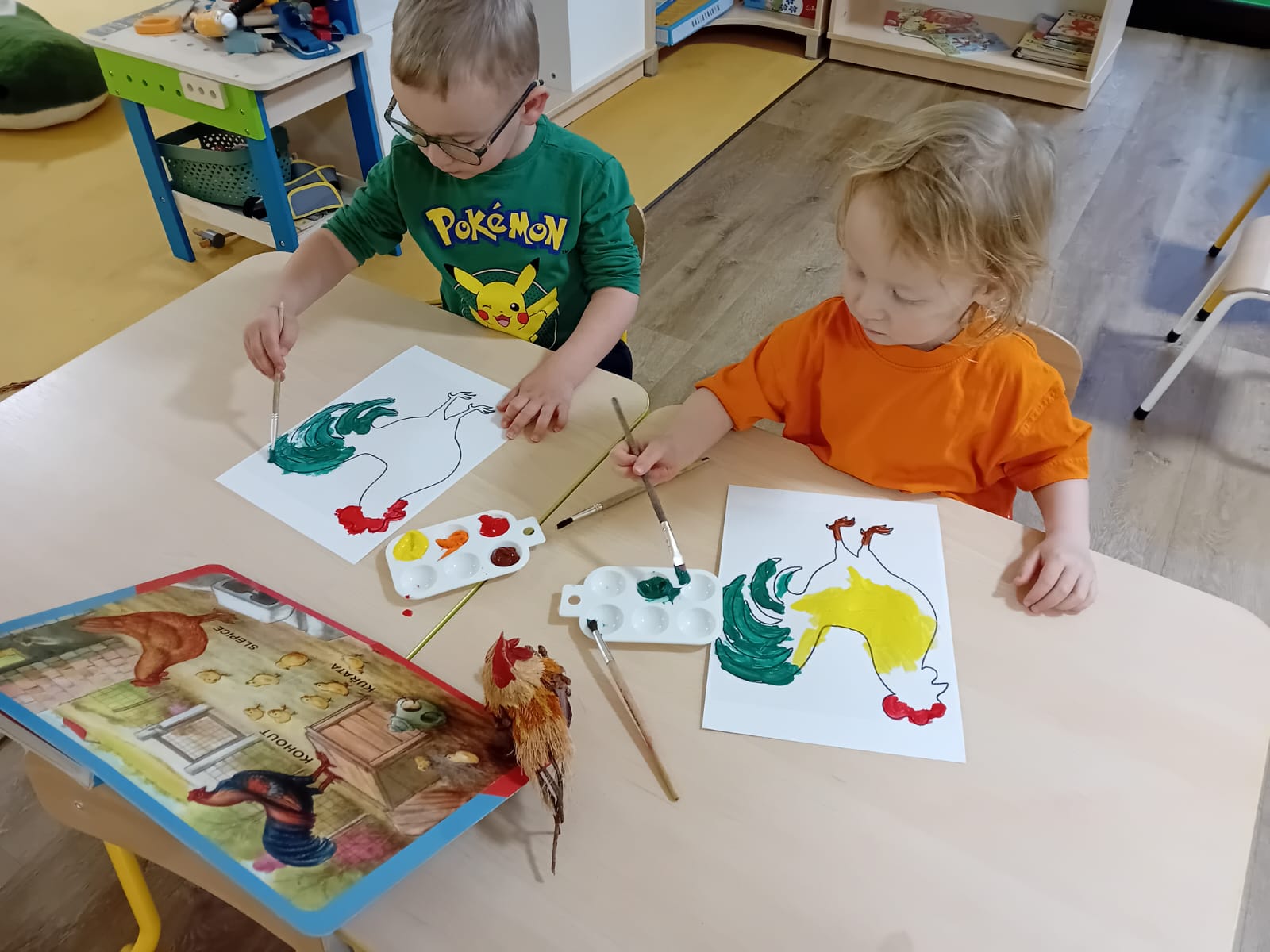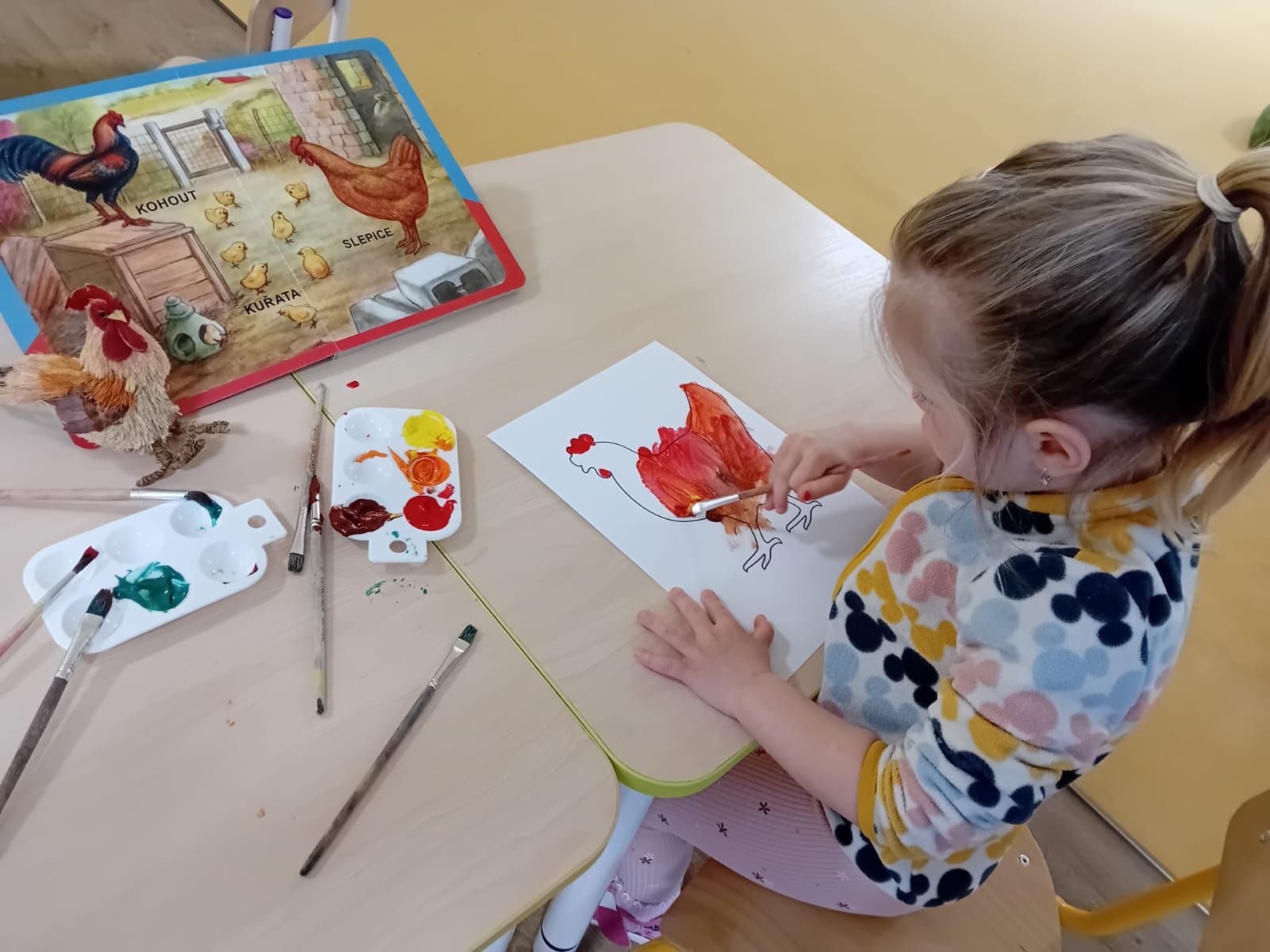 Malování kohoutků a slepiček podle předlohy děti zaujalo a zároveň díky němu nepotřebovaly téměř žádnou asistenci. Dekorování barevným peřím napomohlo k ještě hezčímu efektu.