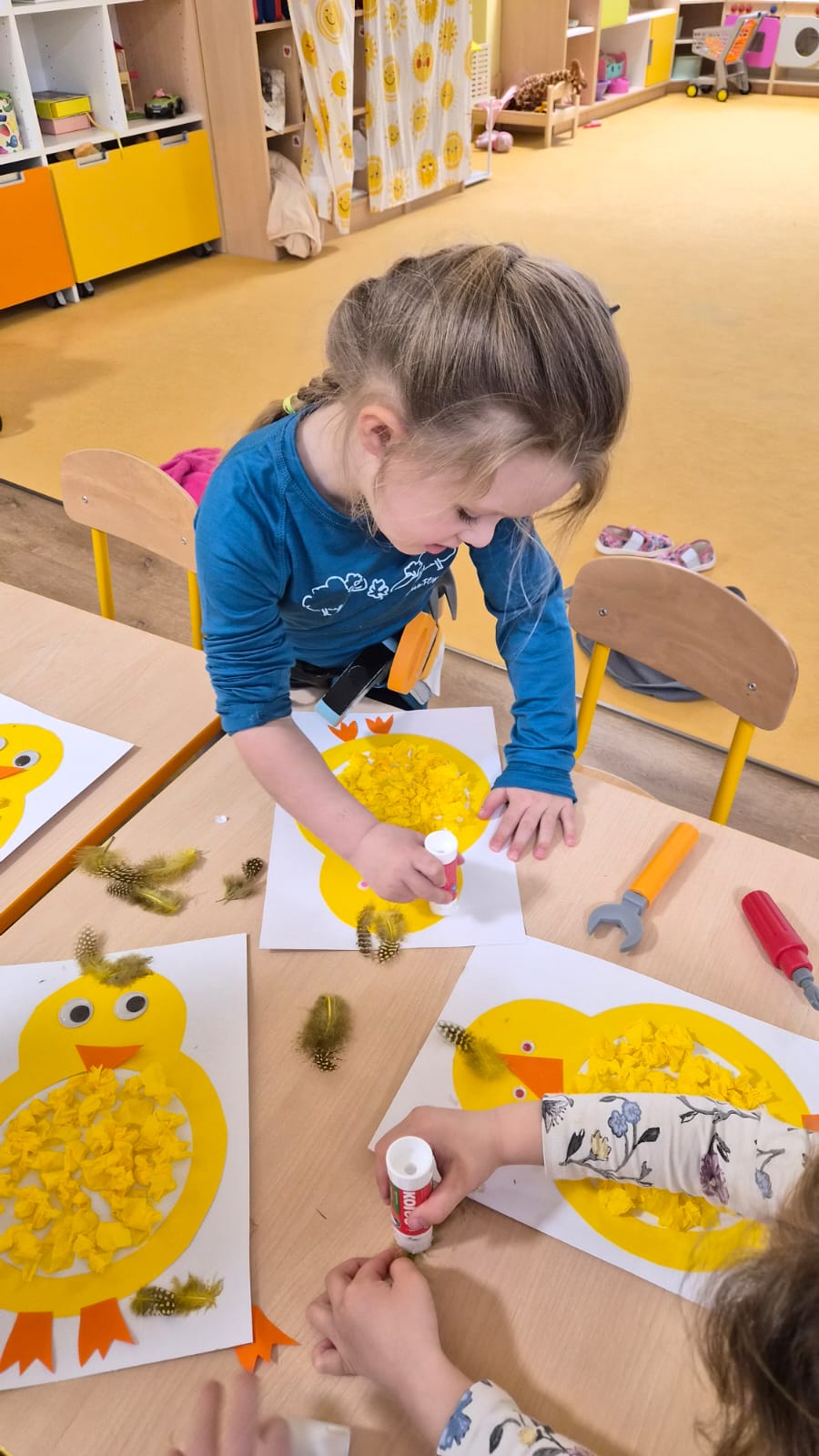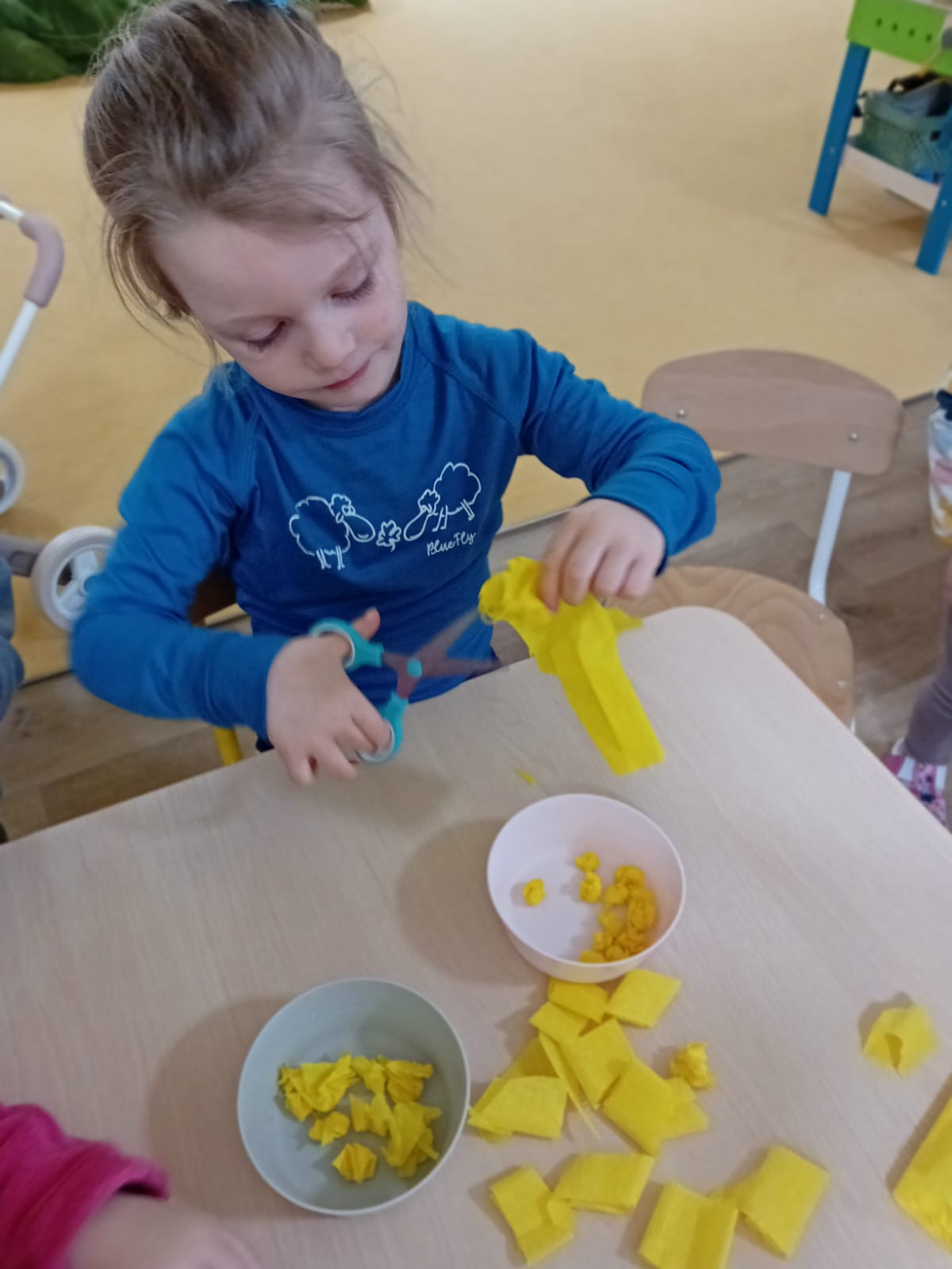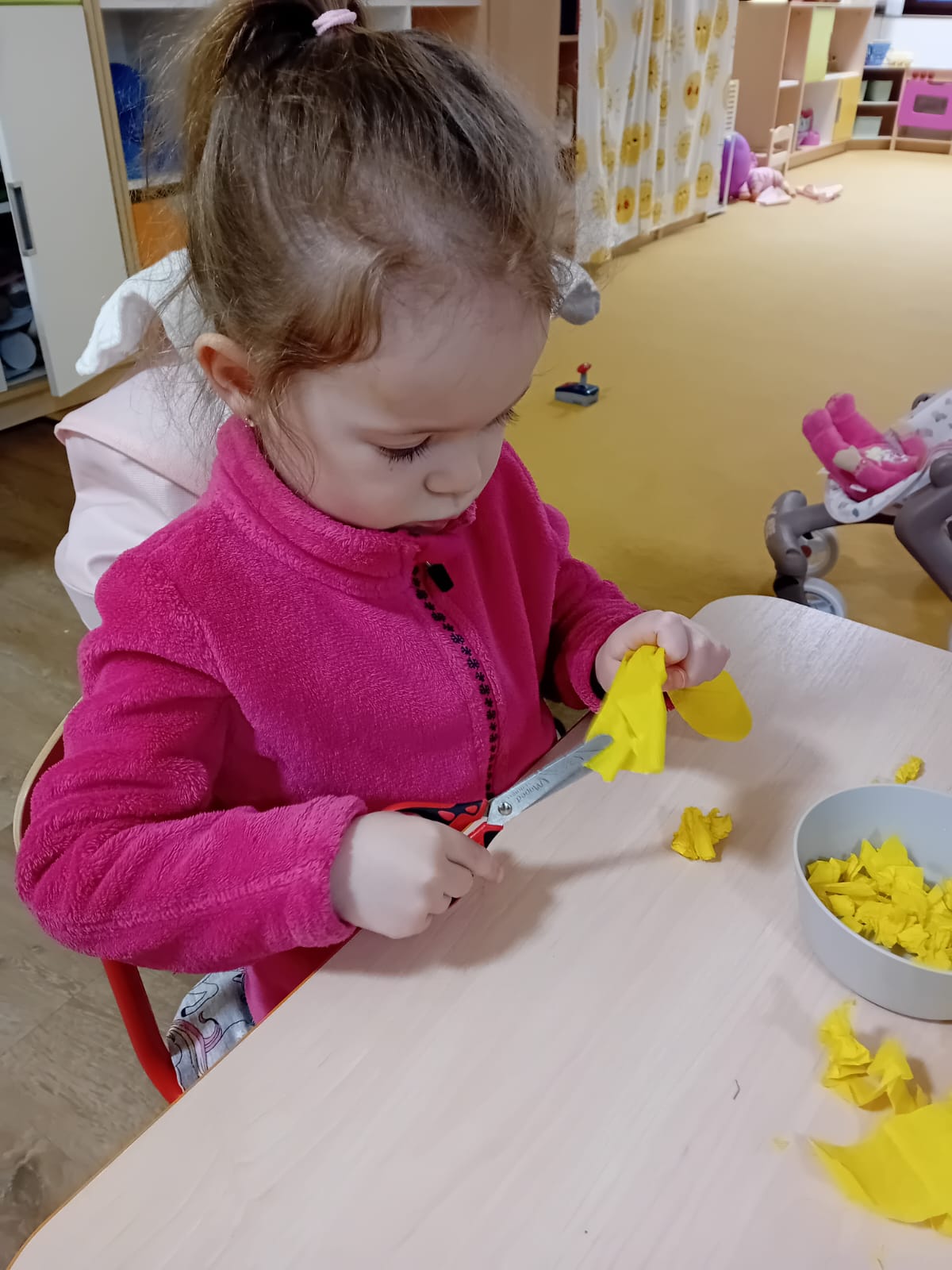 Krepový papír na kuřátka si děti zručně nastříhaly a následně zmuchlaly do kuliček, opět téměř bez asistence. Posuny ve všech oblastech jsou u vašich dětí tak viditelné, z čehož máme obrovskou radost.