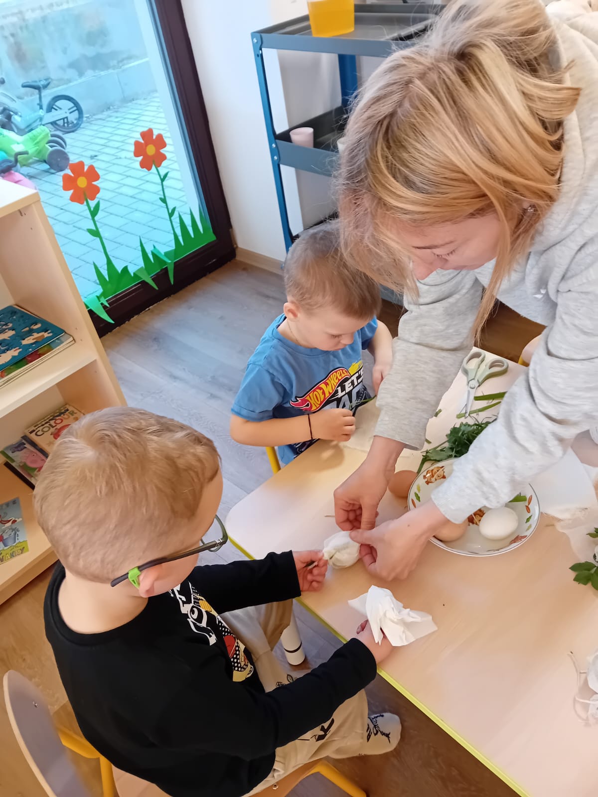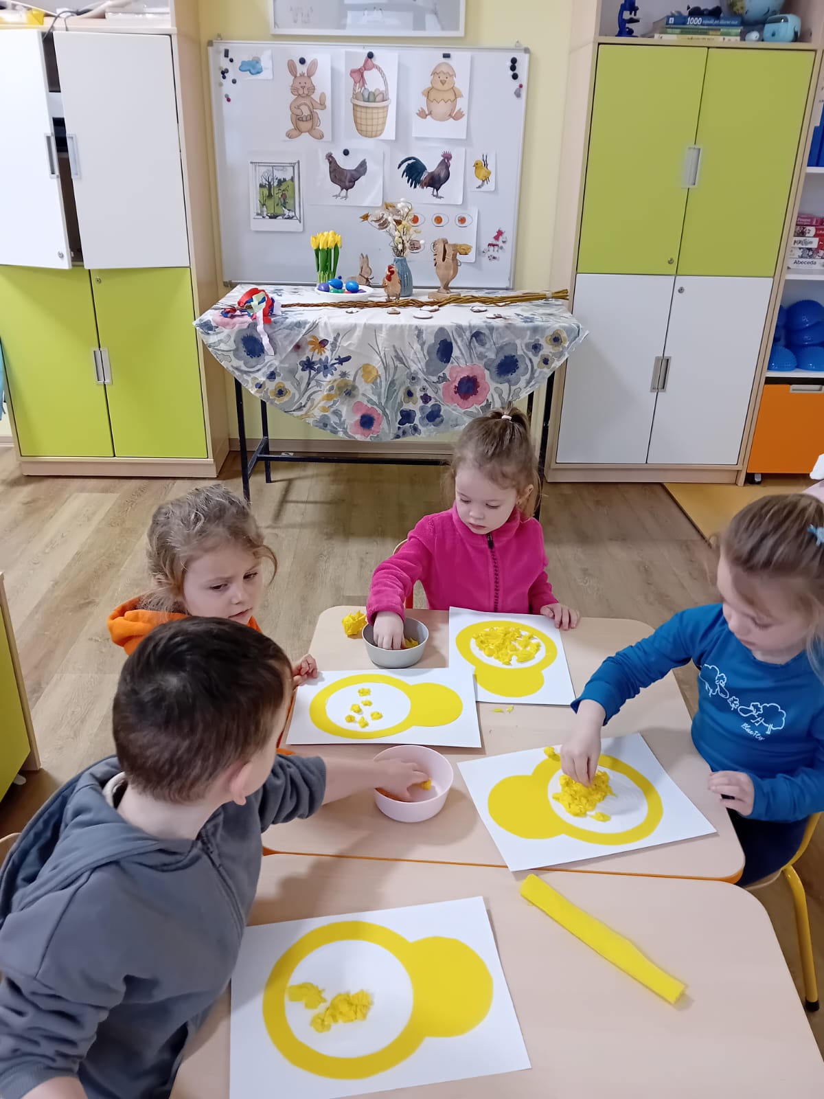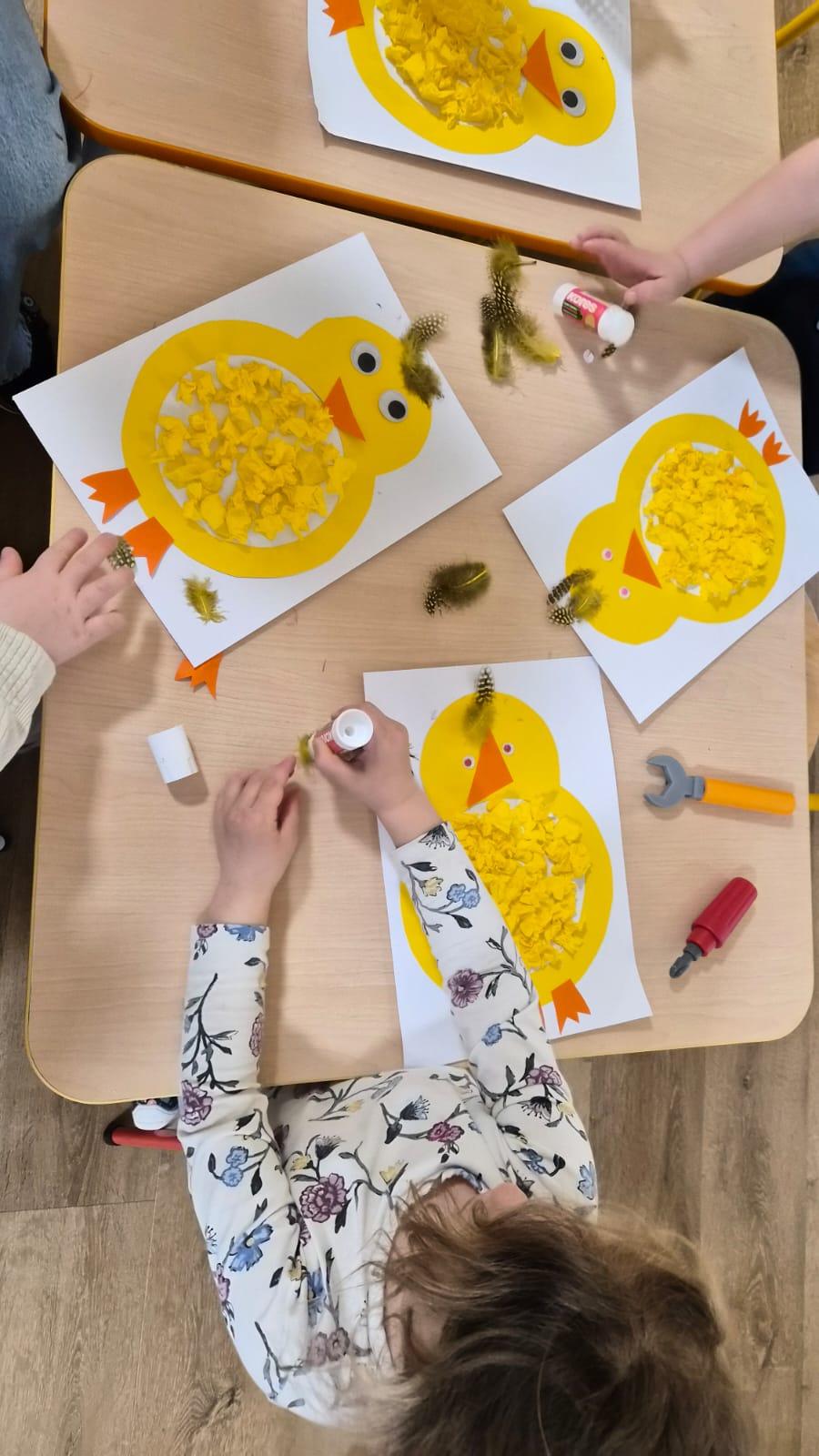 Krepový papír na kuřátka si děti zručně nastříhaly a následně zmuchlaly do kuliček, opět téměř bez asistence. Posuny ve všech oblastech jsou u vašich dětí tak viditelné, z čehož máme obrovskou radost.