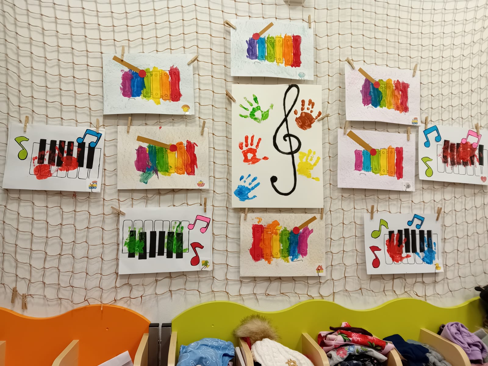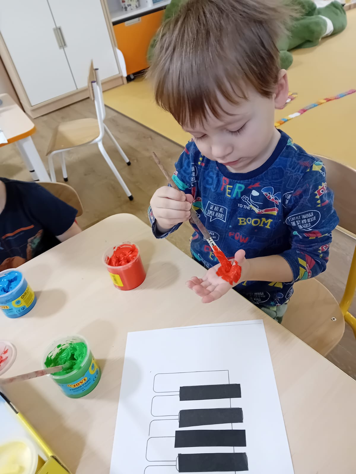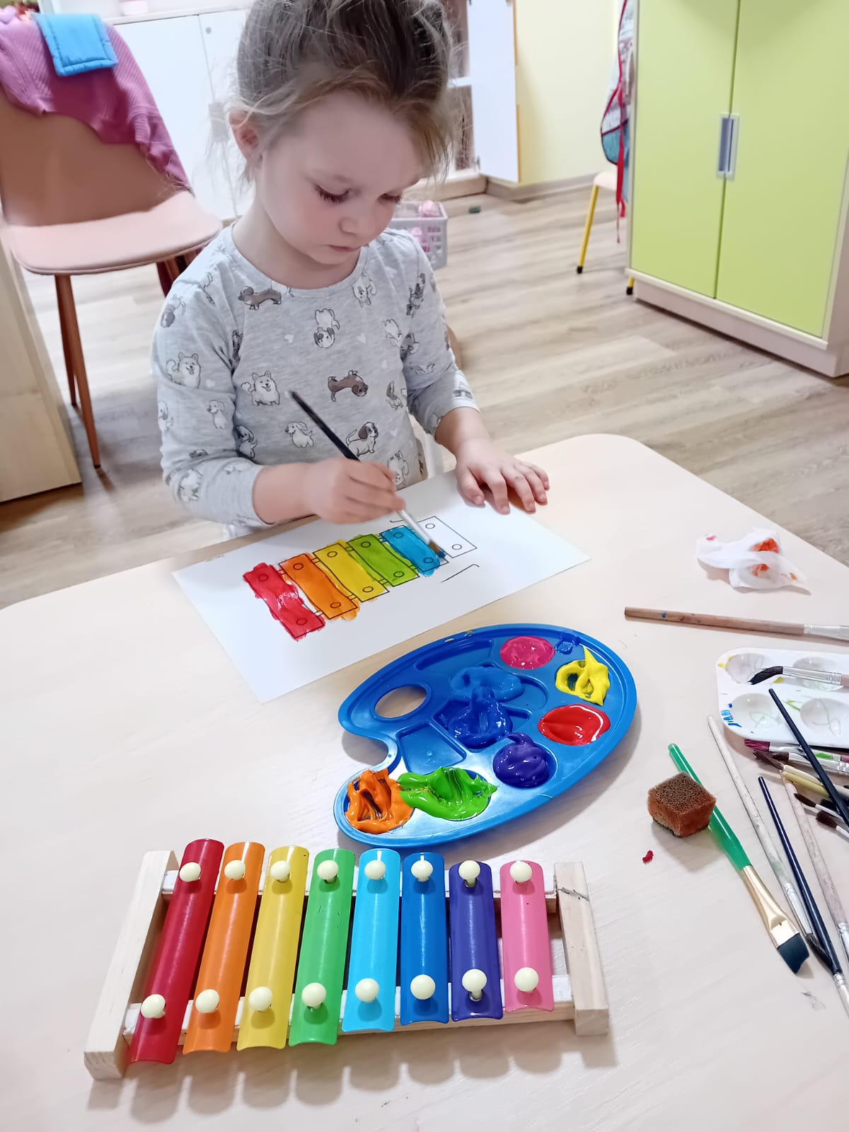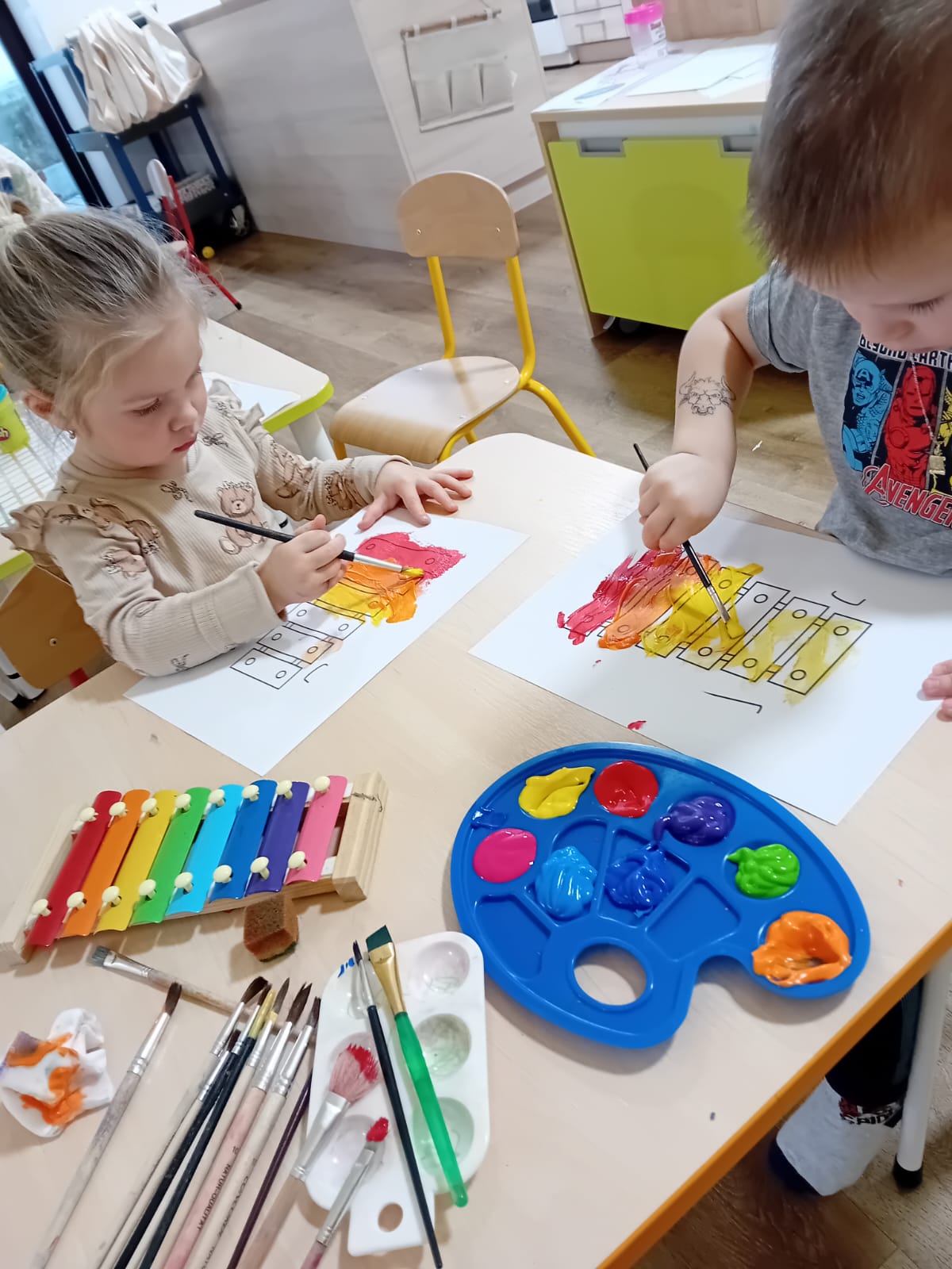 Barvy jsme parádně procvičili při malbě xylofonu. Jemnou motoriku zase při stříhání a modelování.