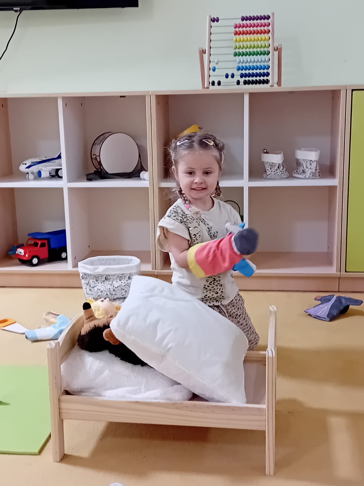 Také jsme si zahráli divadelní představení. Nejprve pohádku o Červené Karkulce a následnou improvizaci, u které se děti střídali a vyzkoušeli si hru s maňáskem.