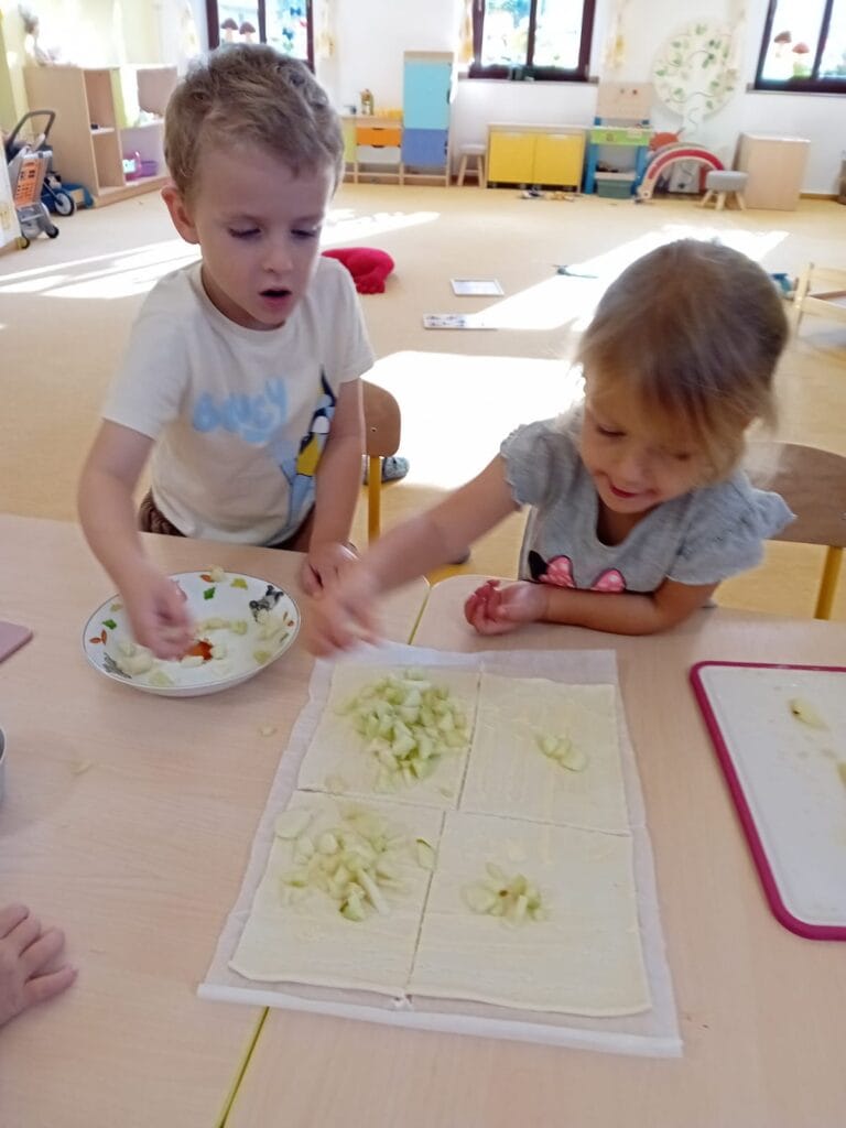 Protože domácí pohoda je často spojená s jídlem, také my jsme nezaháleli. V úterý jsme opět pekli záviny, tentokrát pro naše hosty na středeční besídce, v pátek jsme pak pekli pizzu a vyráběli domácí jablečný mošt.