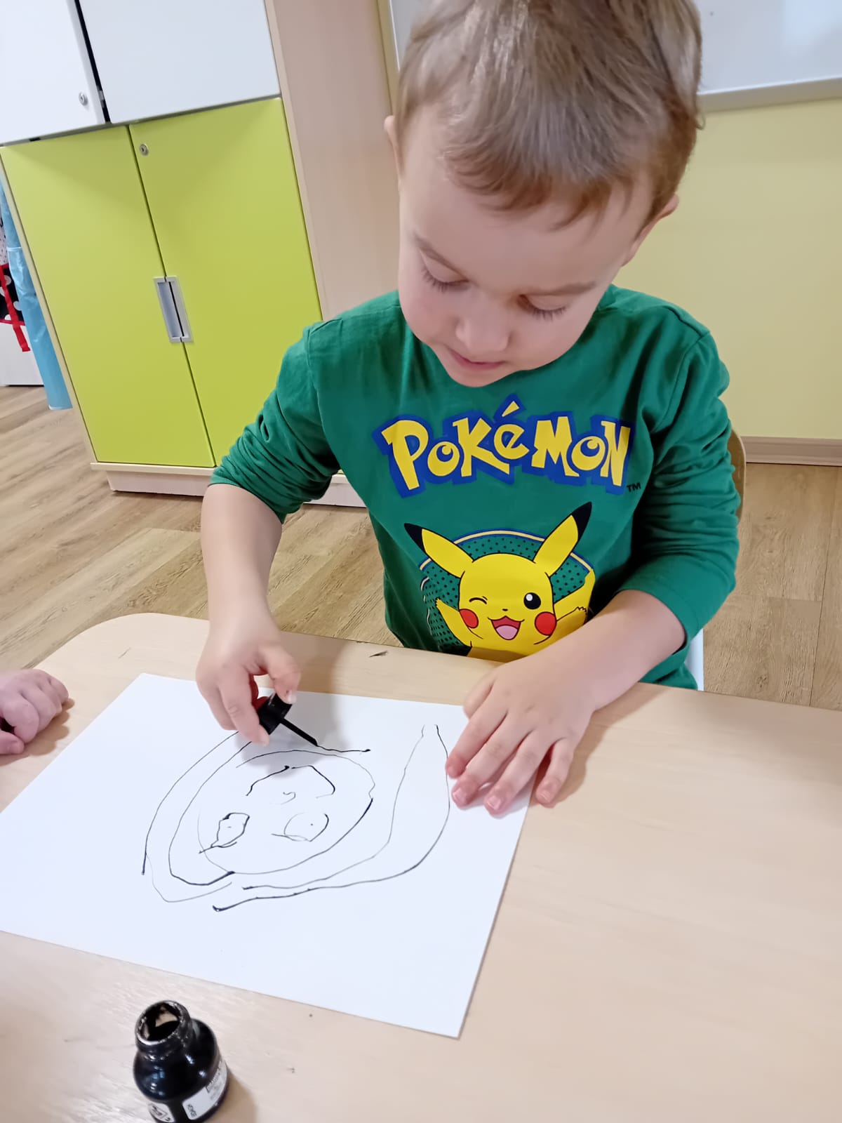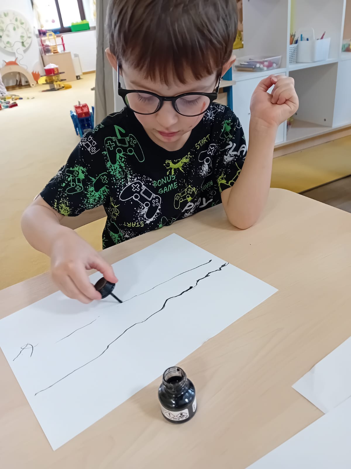 Při výtvarce si děti vyzkoušely kresbu tuší. Vedlo se jim nad očekávání skvěle, proto budeme tuš používat častěji.