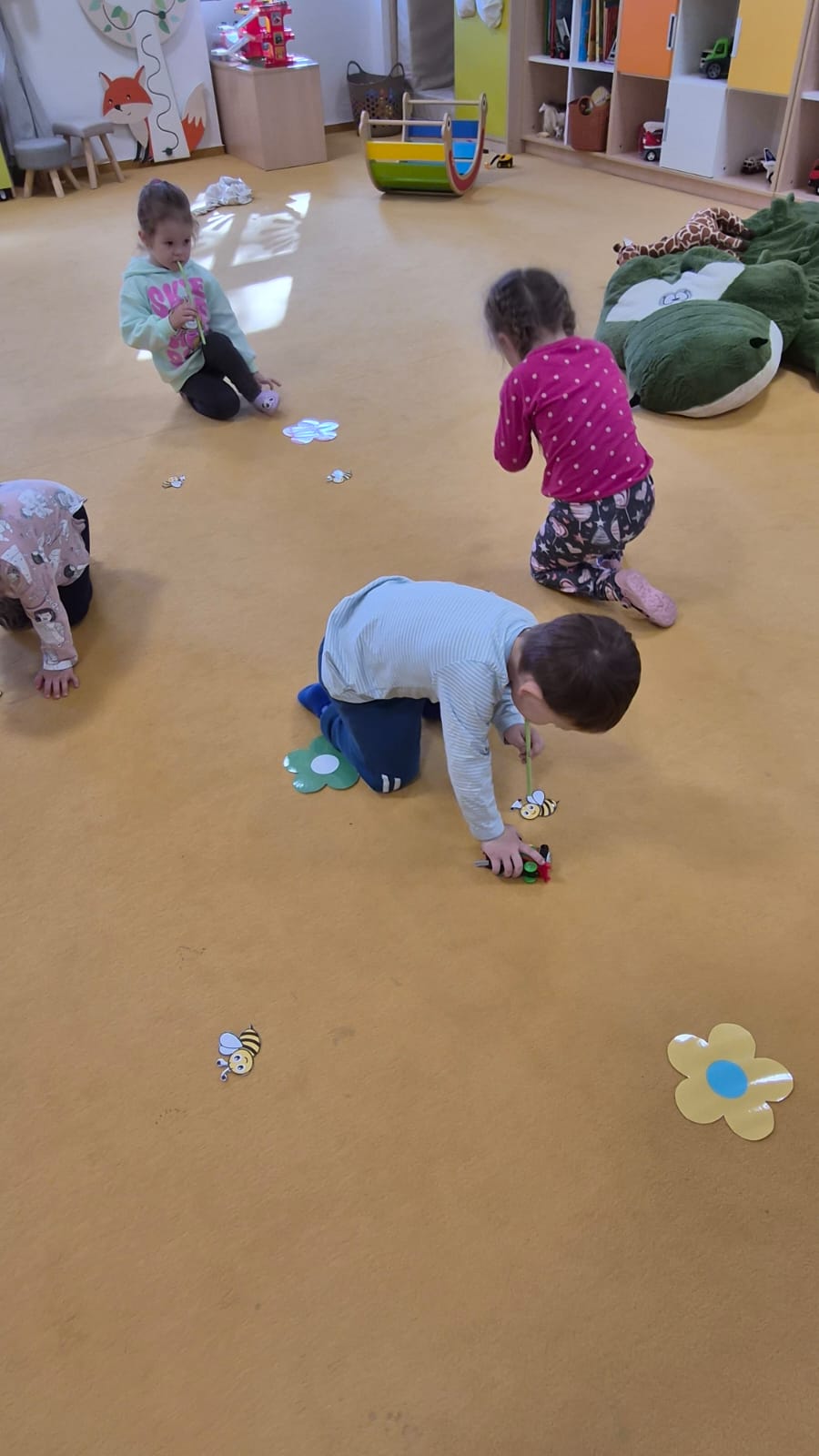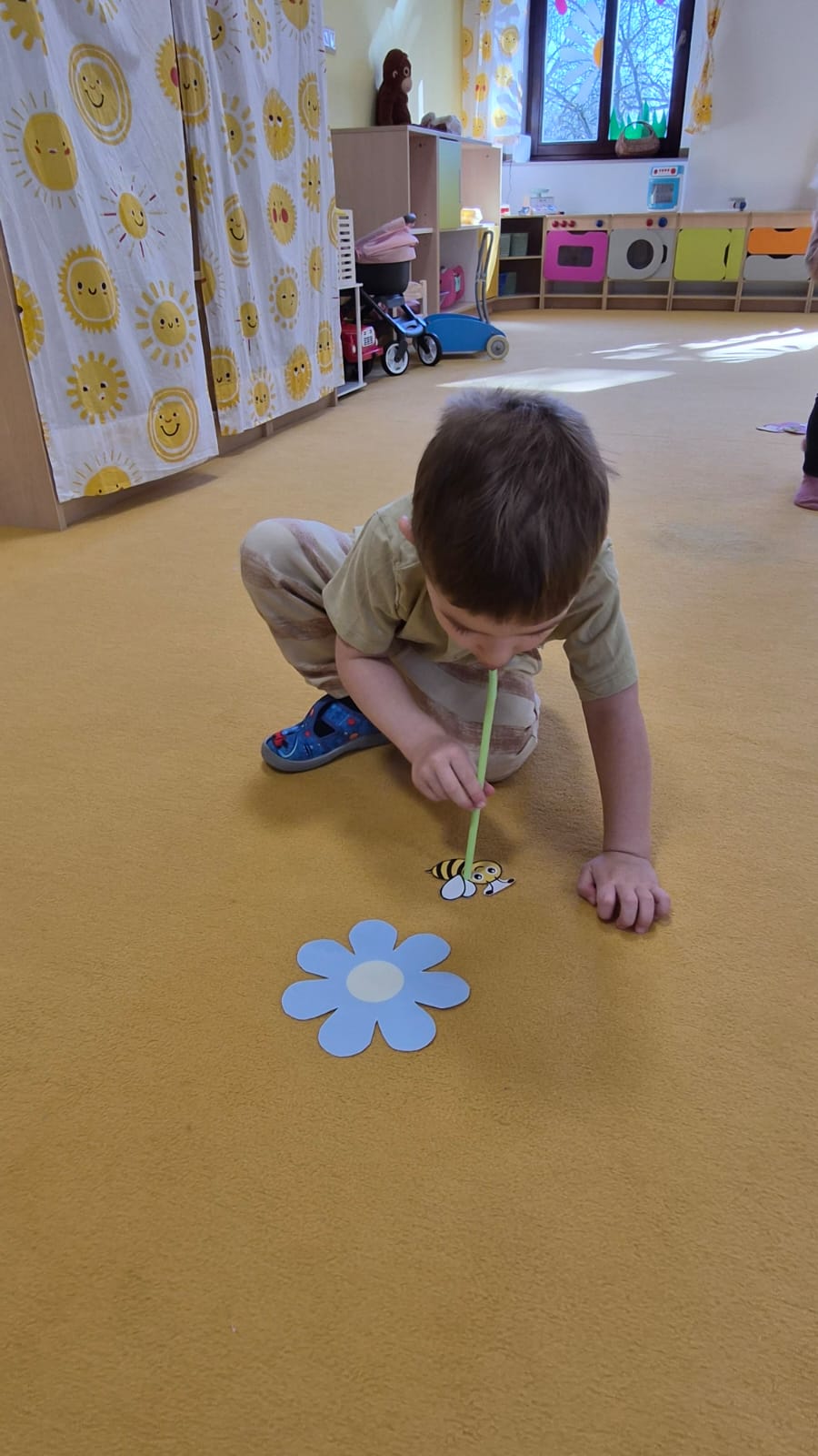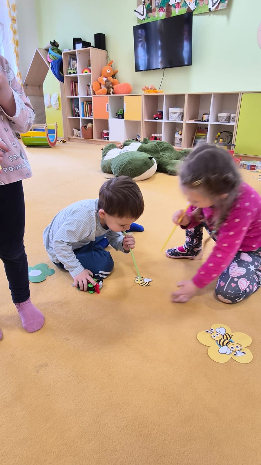 Tolik prospěšné dechové cvičení tentokrát děti posílily pomocí brček, kdy vdechem přidržovaly včeličku, aby ji následně umístily na kytičku.