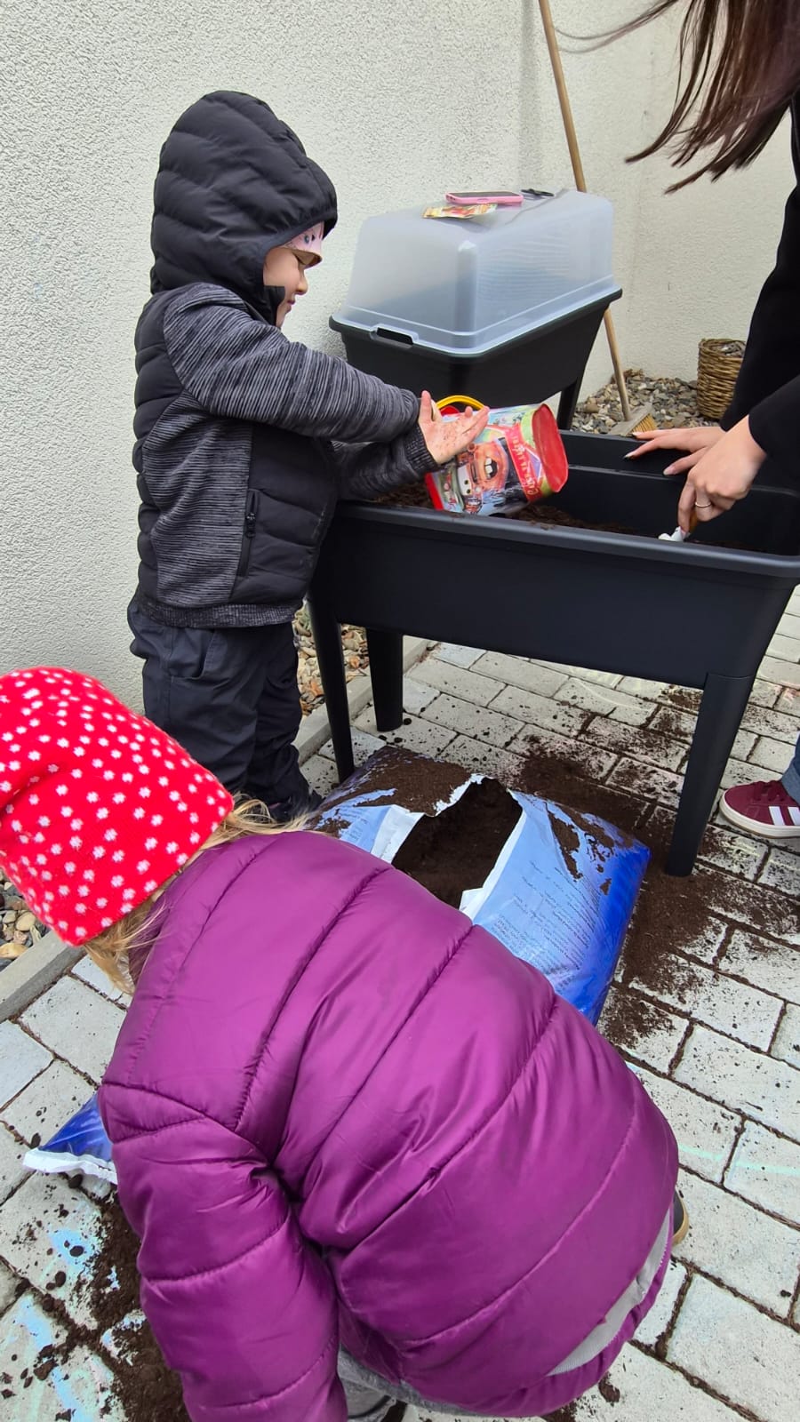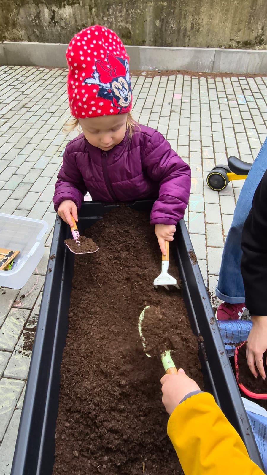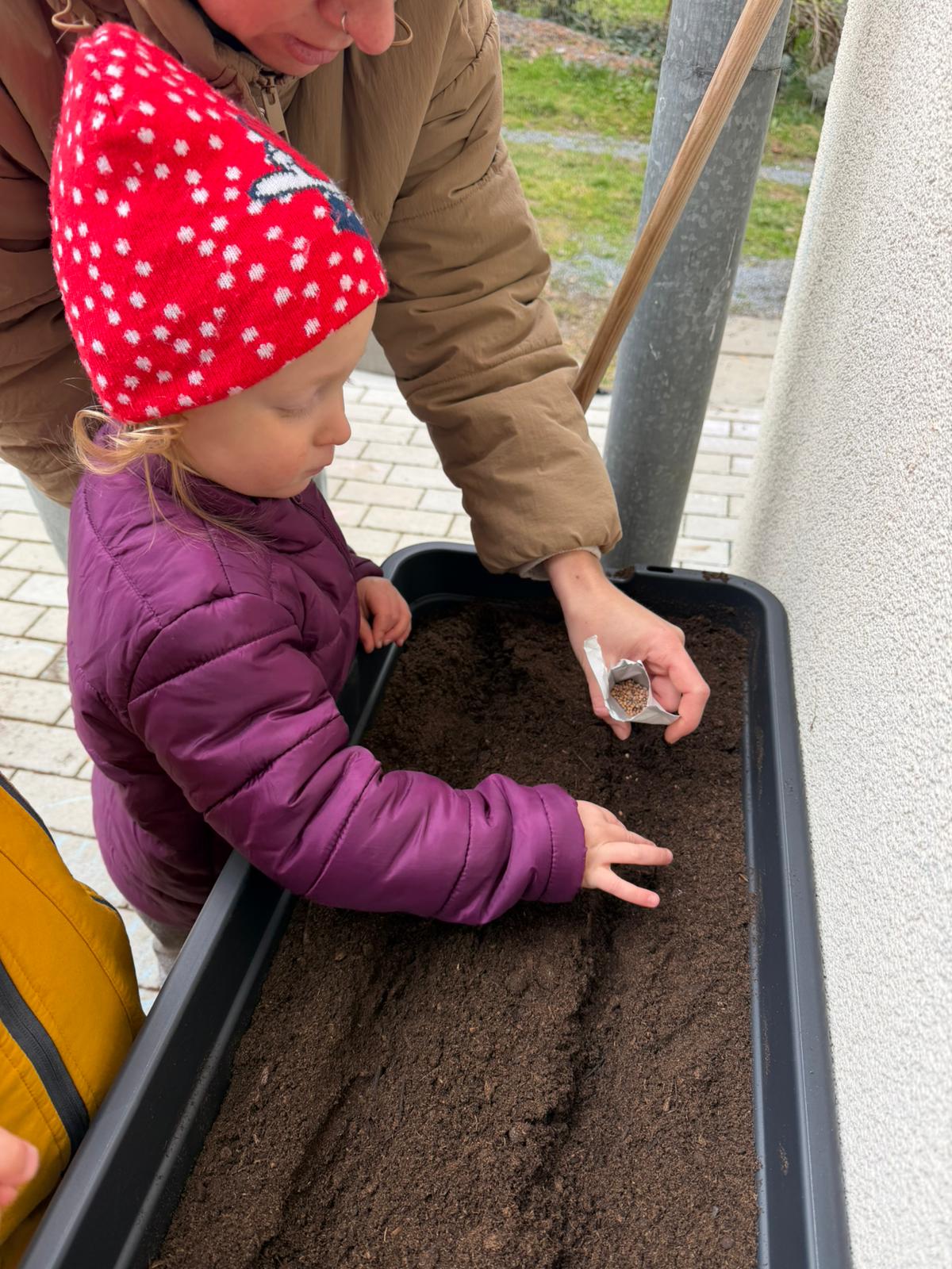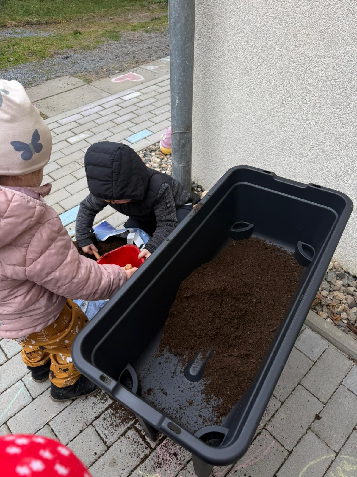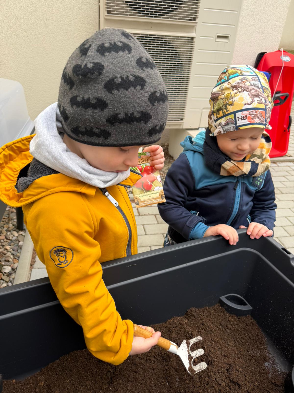 Venku jste si mohli všimnout nových vyvýšených truhlíků, do kterých děti pod vedením Evičky, naší nejnadanější zahradnice, zasadily nejprve ředkvičky, následovat bude mrkev a hrášek.