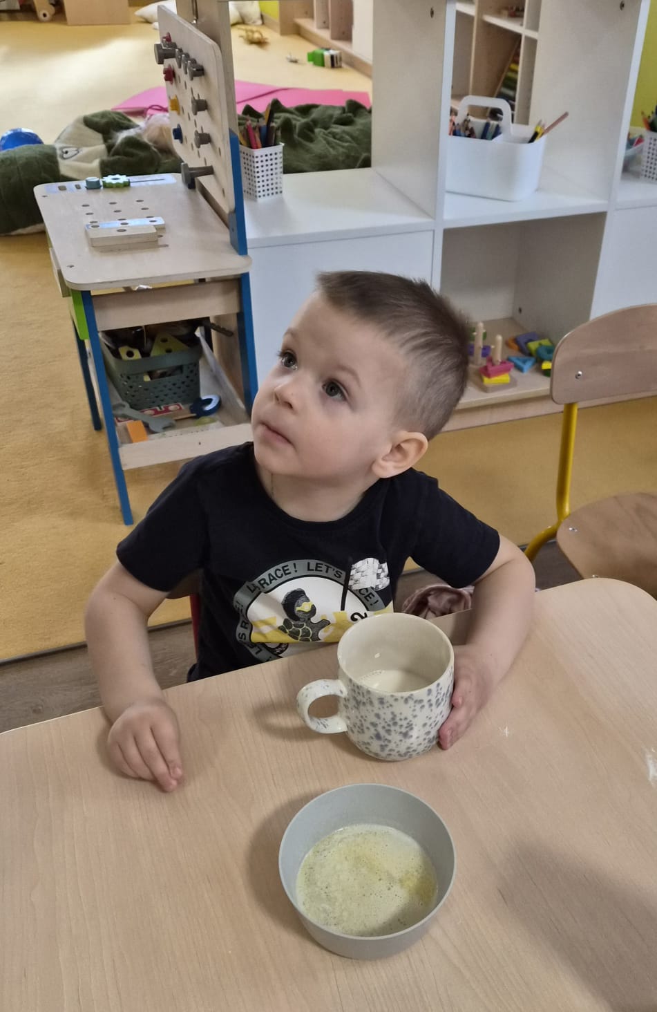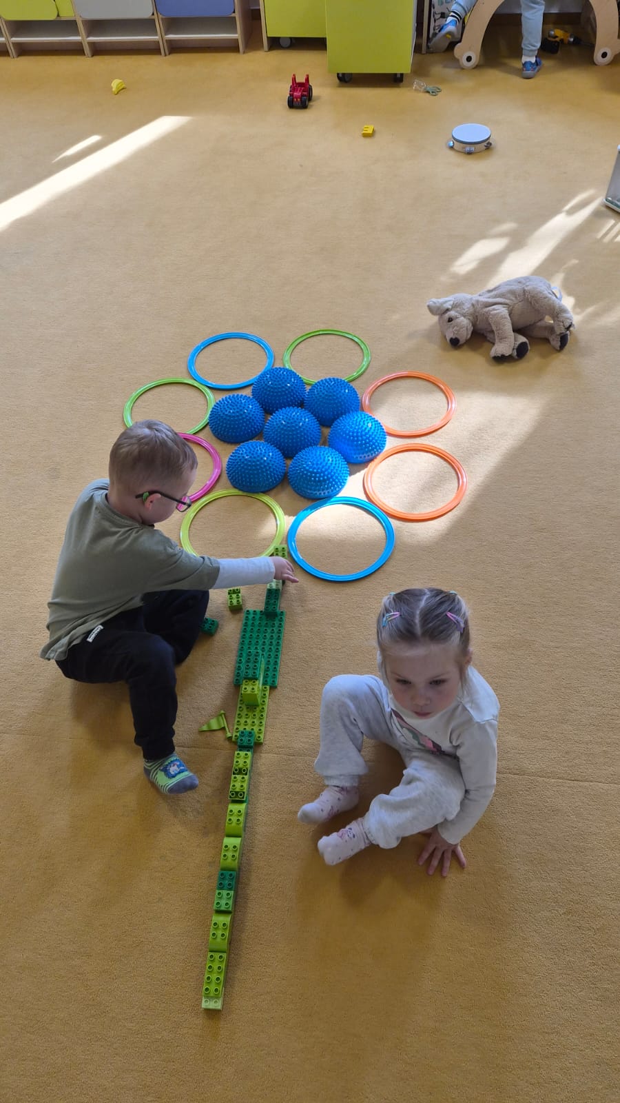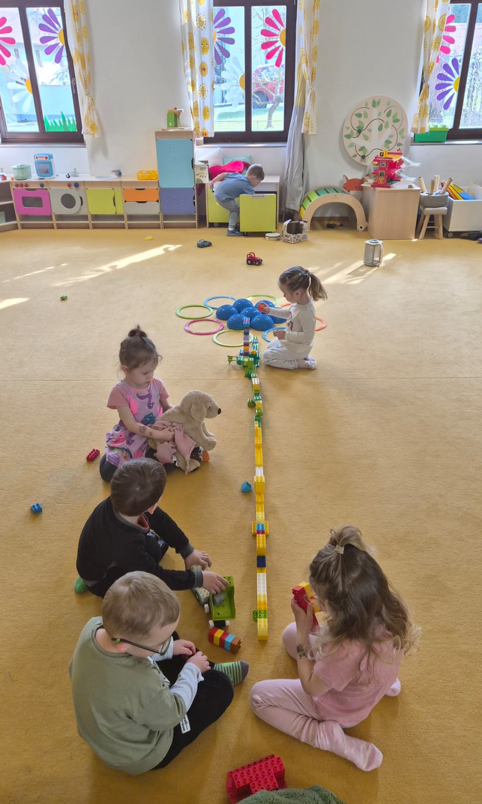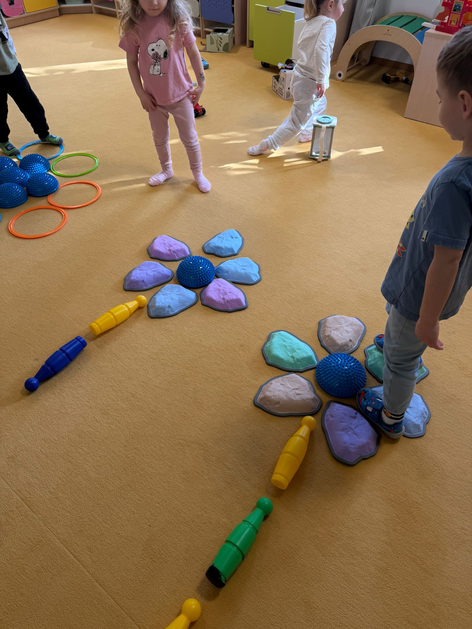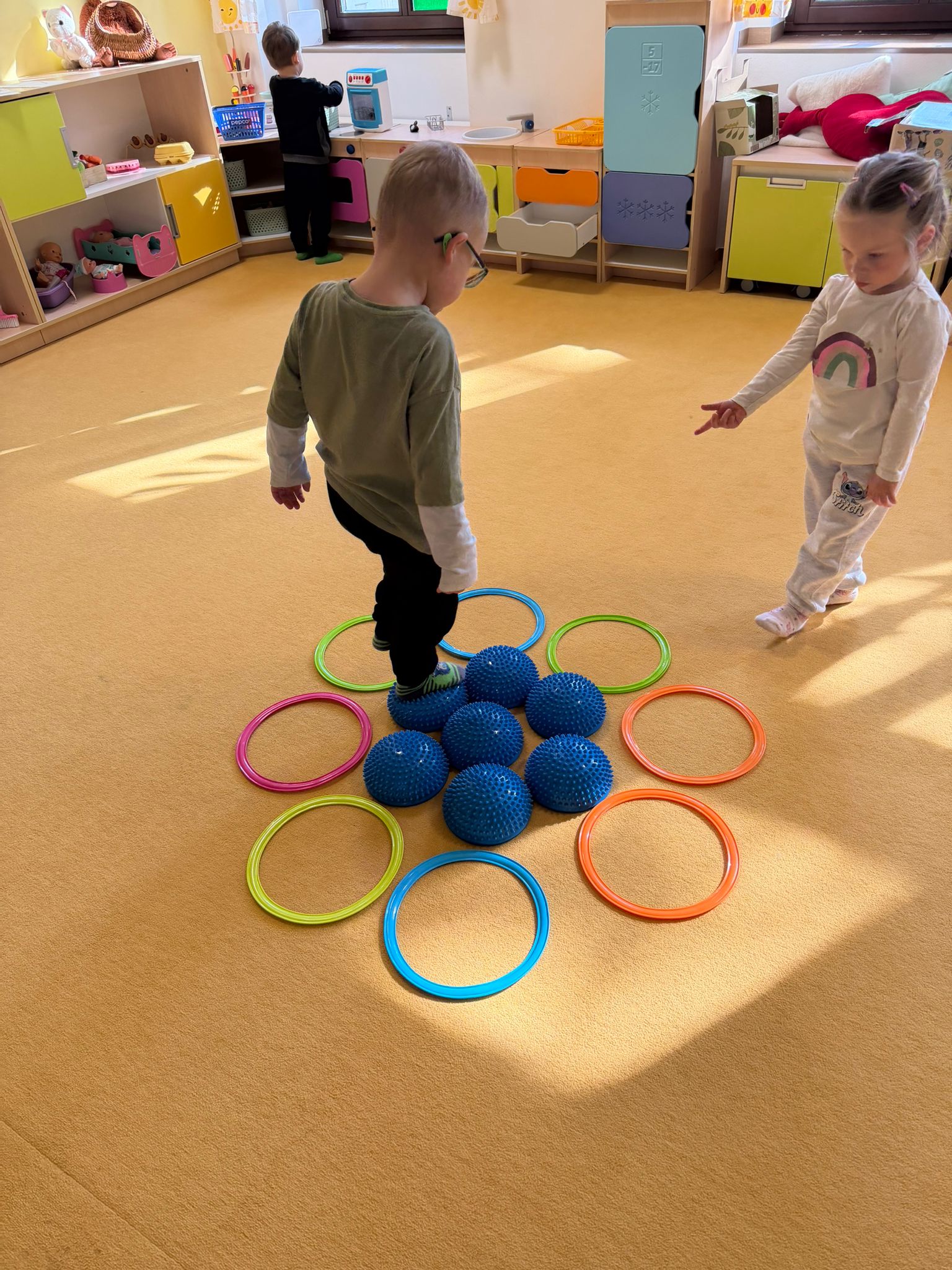 Ranní rozcvička byla zaměřena na klenbu nohy, chůzi na boso a nášlapový chodníček. Děti také hrály hru na barevnou louku, kdy reagovaly na signál a střídání tempa.