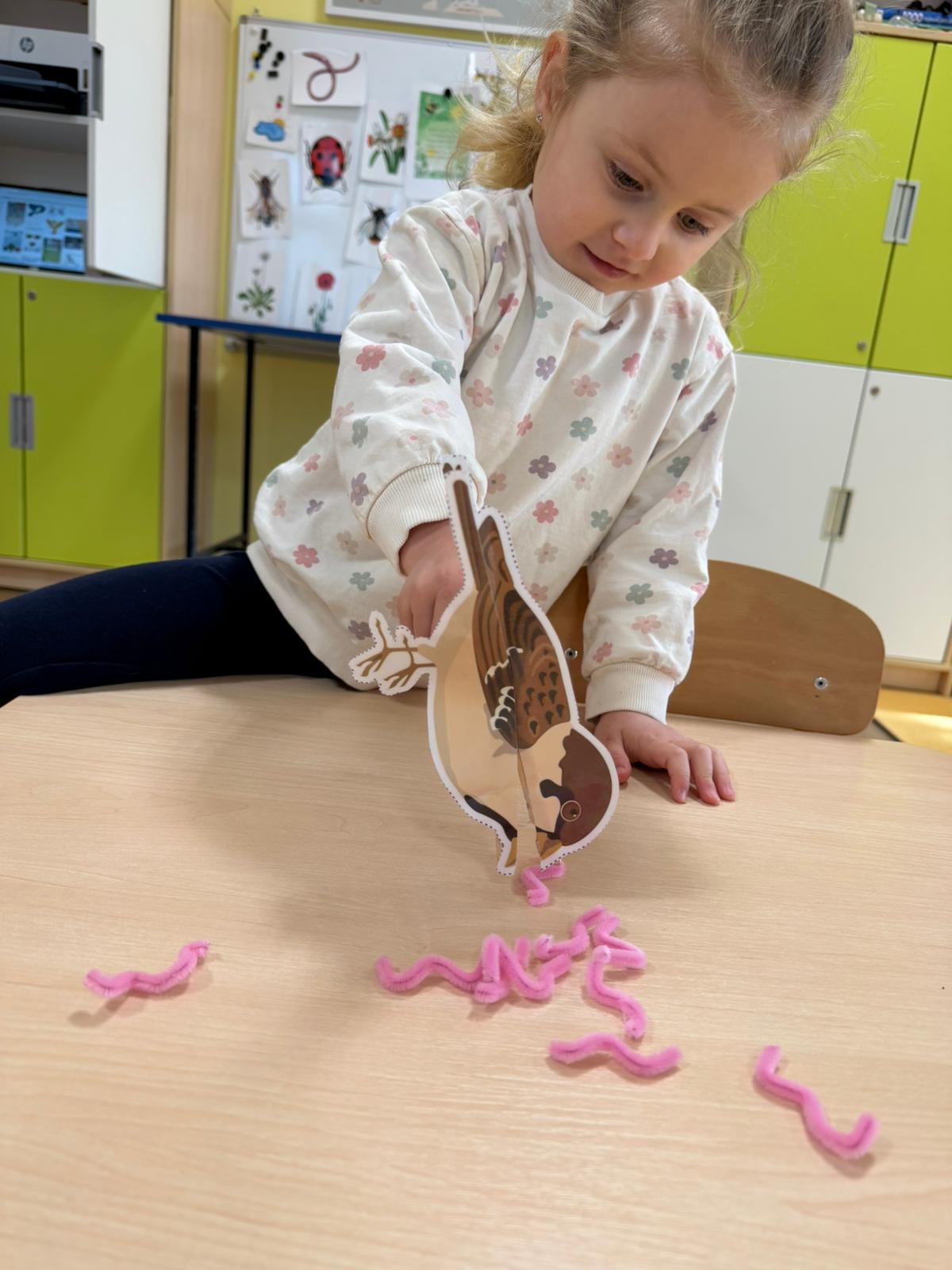 Jemnou motoriku a špetkový úchop děti procvičily manipulační činností s ptáčkem, který měl díky připevněnému kolíčku “schopnost” otevírat zobáček.