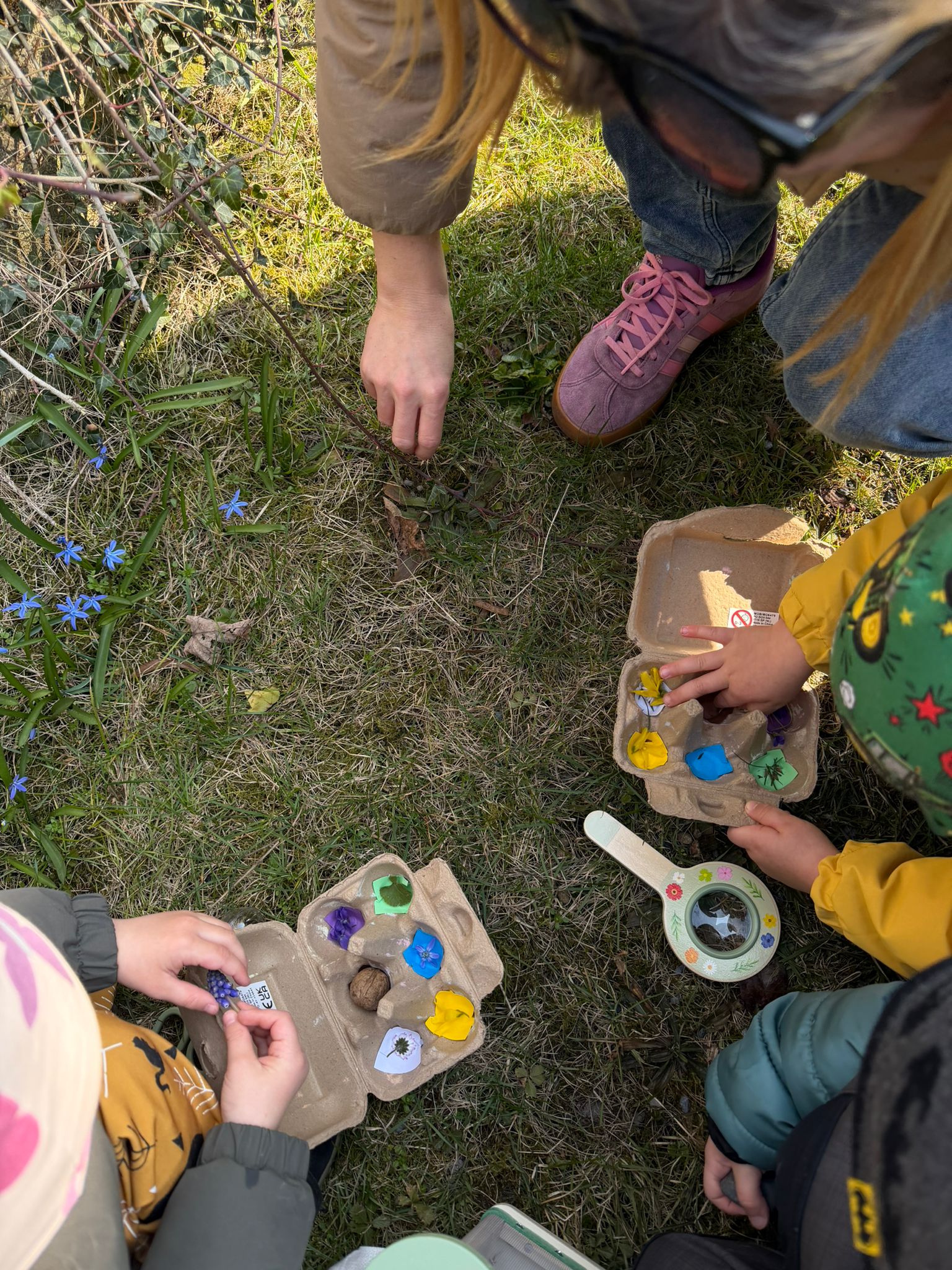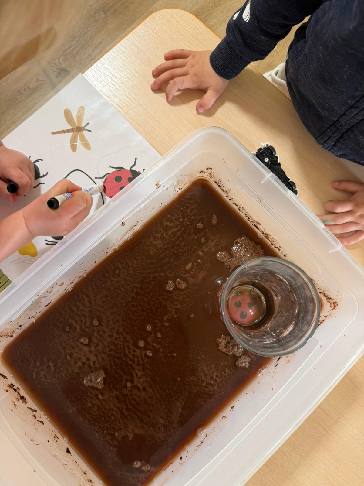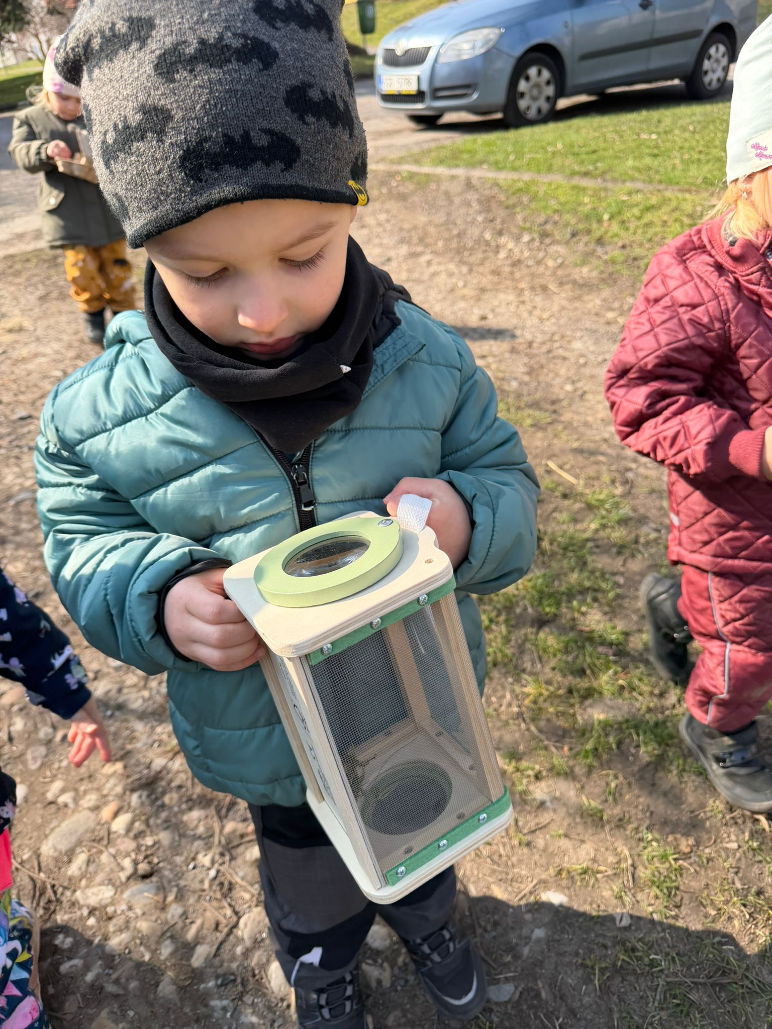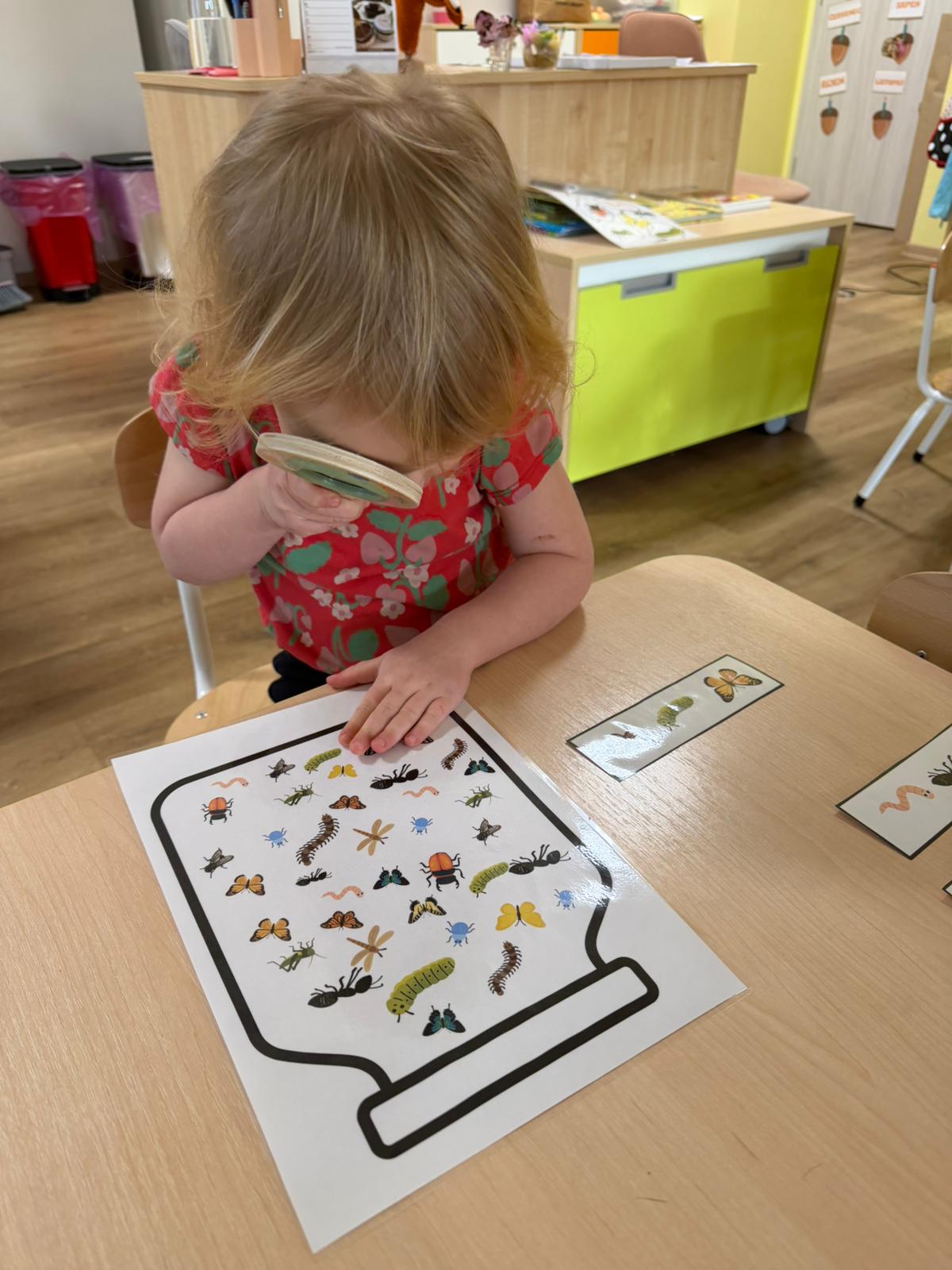 Zvídavost děti projevily při manipulaci s lupou, nebo hledání zvířátek schovaných v tmavé tekutině. Venku plnily úkoly a sbíraly přírodniny, které dělily podle barev.